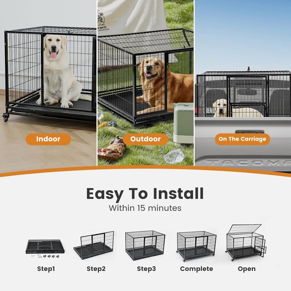 Assembly is easy! No tools required, and it can be set up in just minutes. The 360-degree lockable rolling casters allow you to move the dog kennel outside effortlessly. The casters feature a locking mechanism to keep the dog house stable and prevent sliding.
