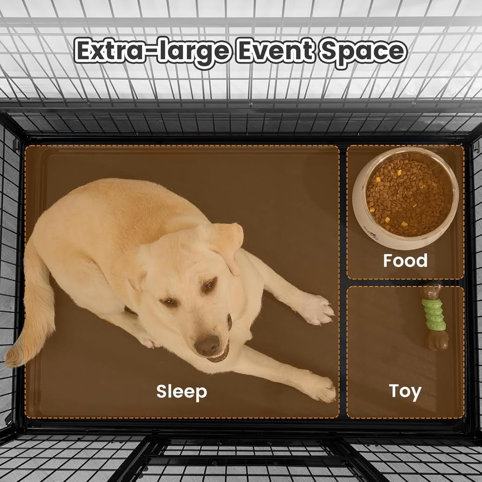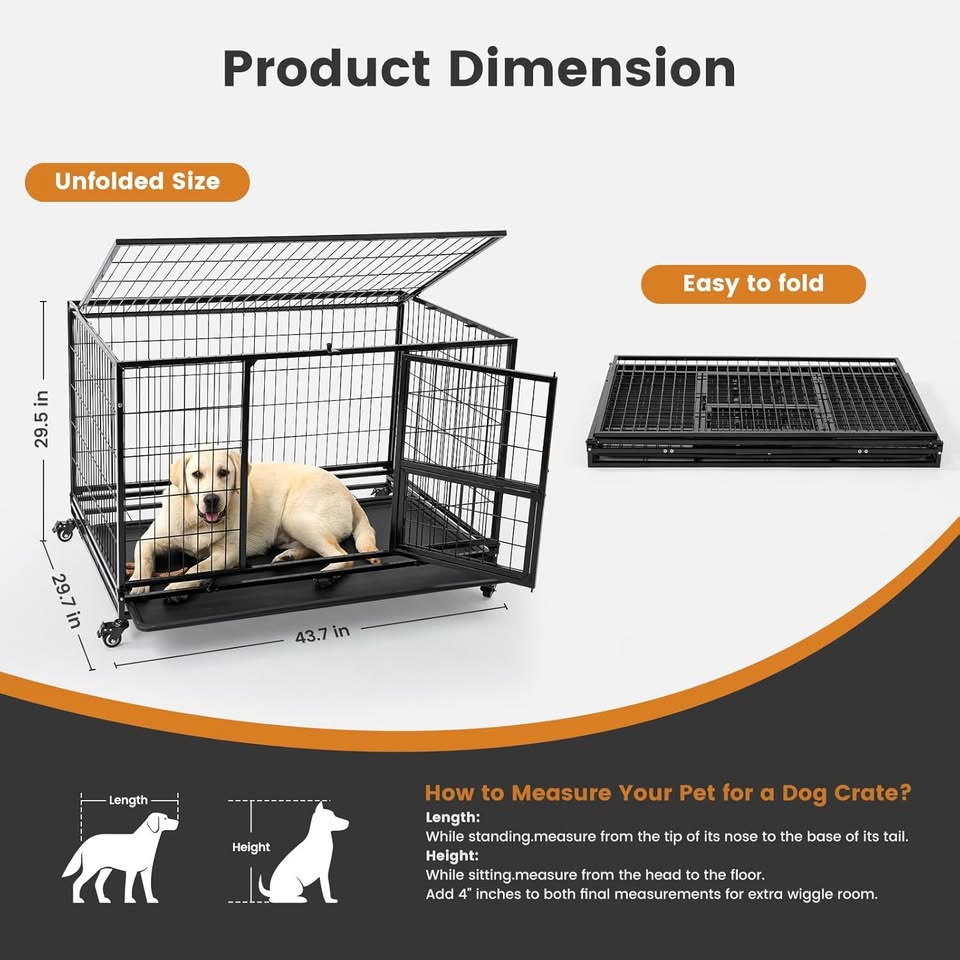 This sturdy heavy-duty dog case is constructed with ultra-strong, thickened metal, designed specifically for energetic "Aggressive Chewers". Cage Dimensions: 43.7"L x 29.7"W x 29.5"H. The body is treated with anti-rust coating, ensuring durability.
