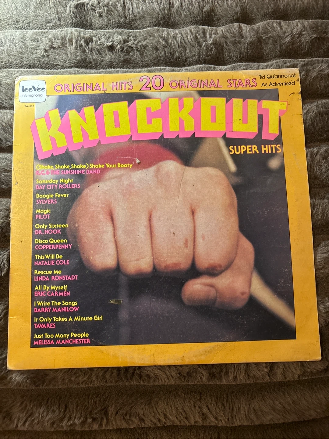 Selling a vintage "Knockout Super Hits" vinyl record featuring 20 original stars. It includes hits like "Shake, Shake, Shake Your Booty" by KC & The Sunshine Band, "Saturday Night" by Bay City Rollers, and many more! A great addition for any vinyl collector