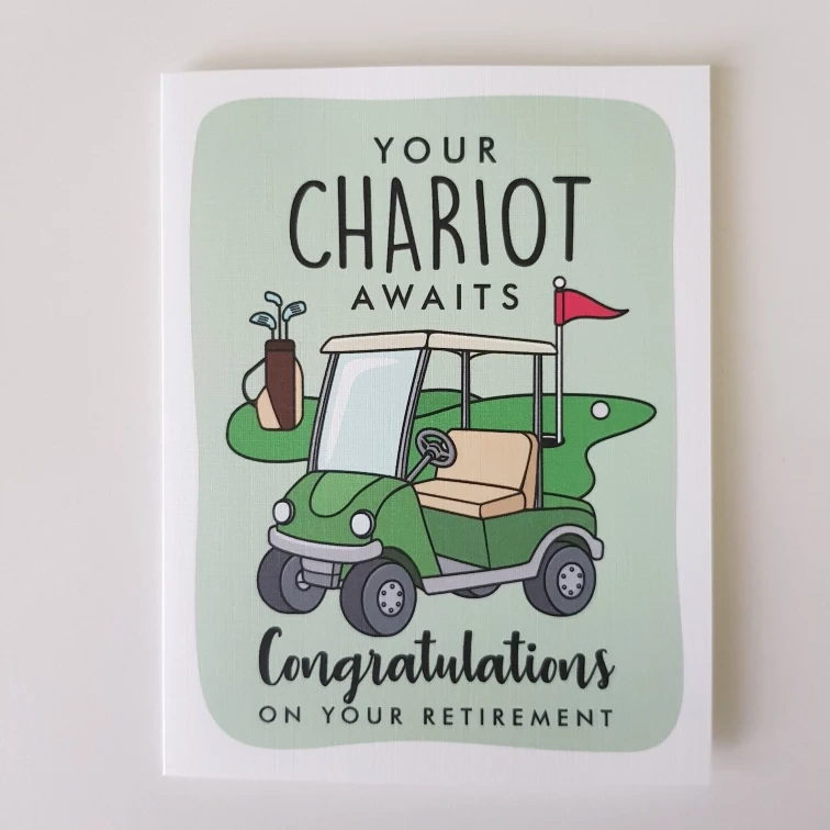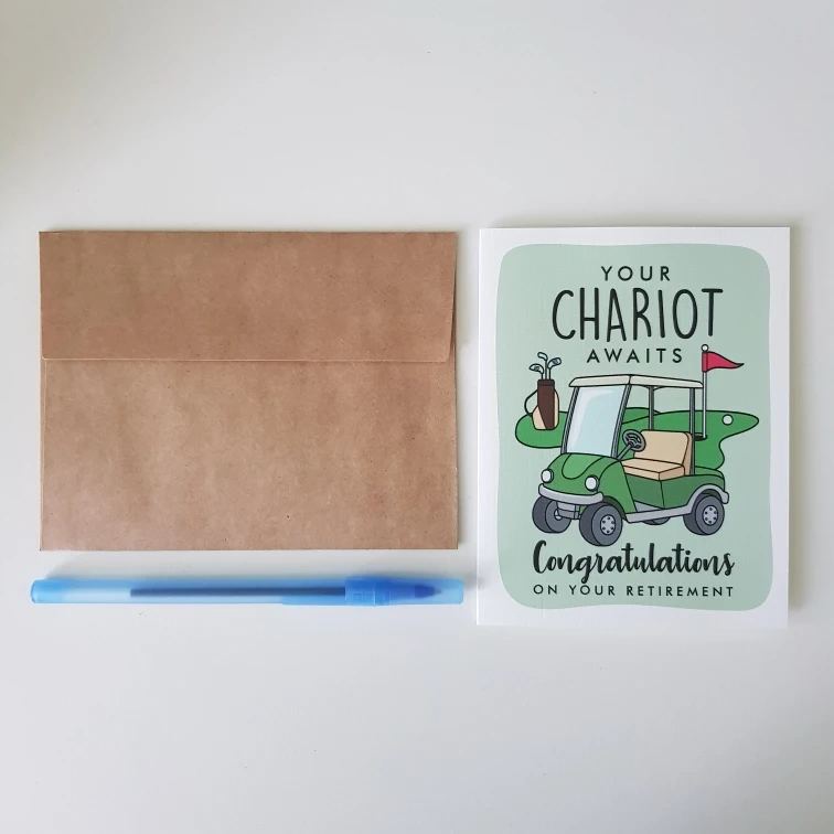 A brand new retirement card featuring a cute golf cart design! It is completely blank inside, ready for you to write your congratulations message. Comes with a brown kraft paper envelope. The card was delivered way too late so we never ended up gifting it.