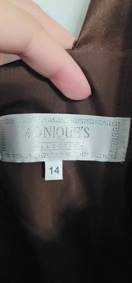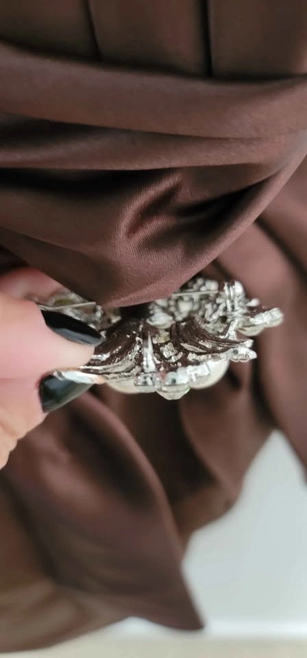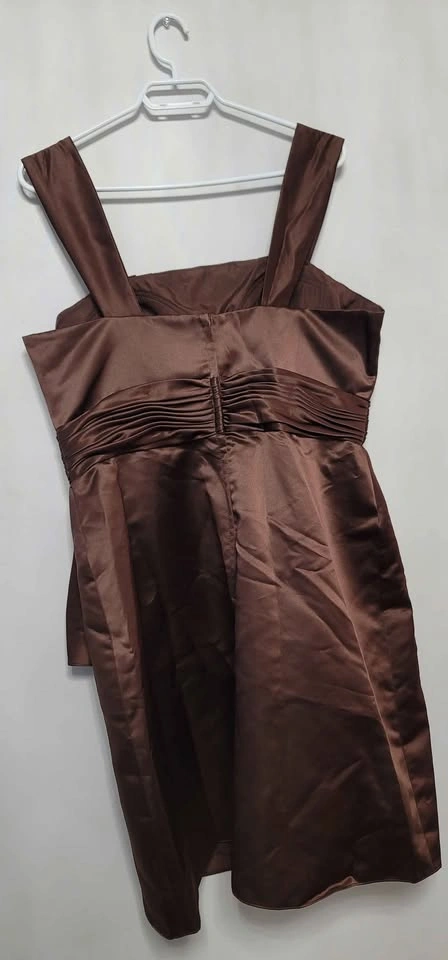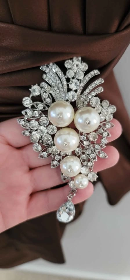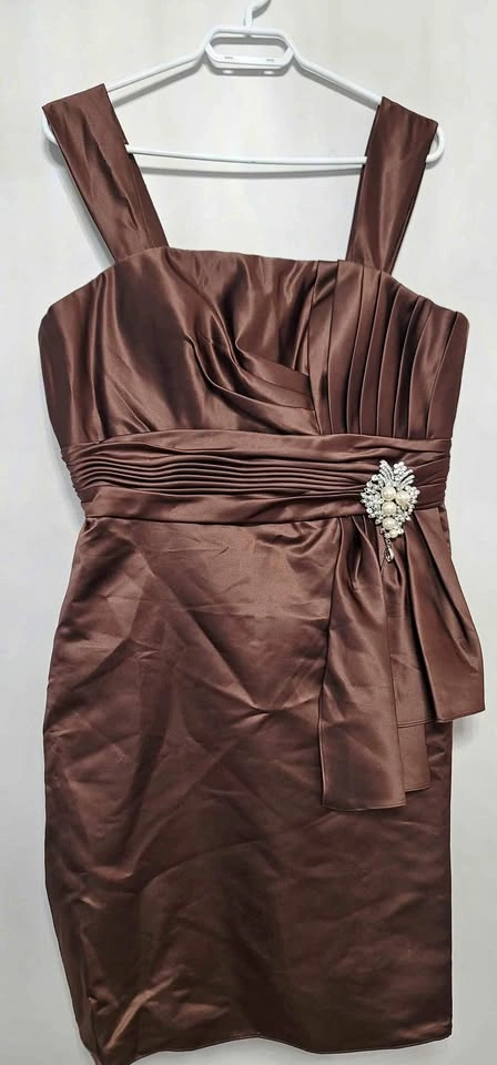 Never worn, wedding was cancelled. Beautiful chocolate brown color with removable brouche. Brouche intact, all gems on it.
