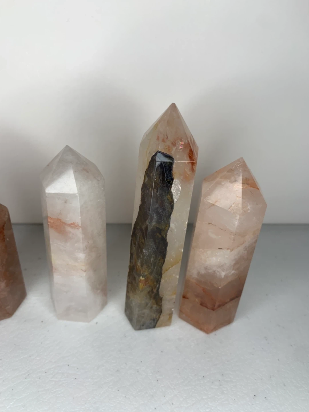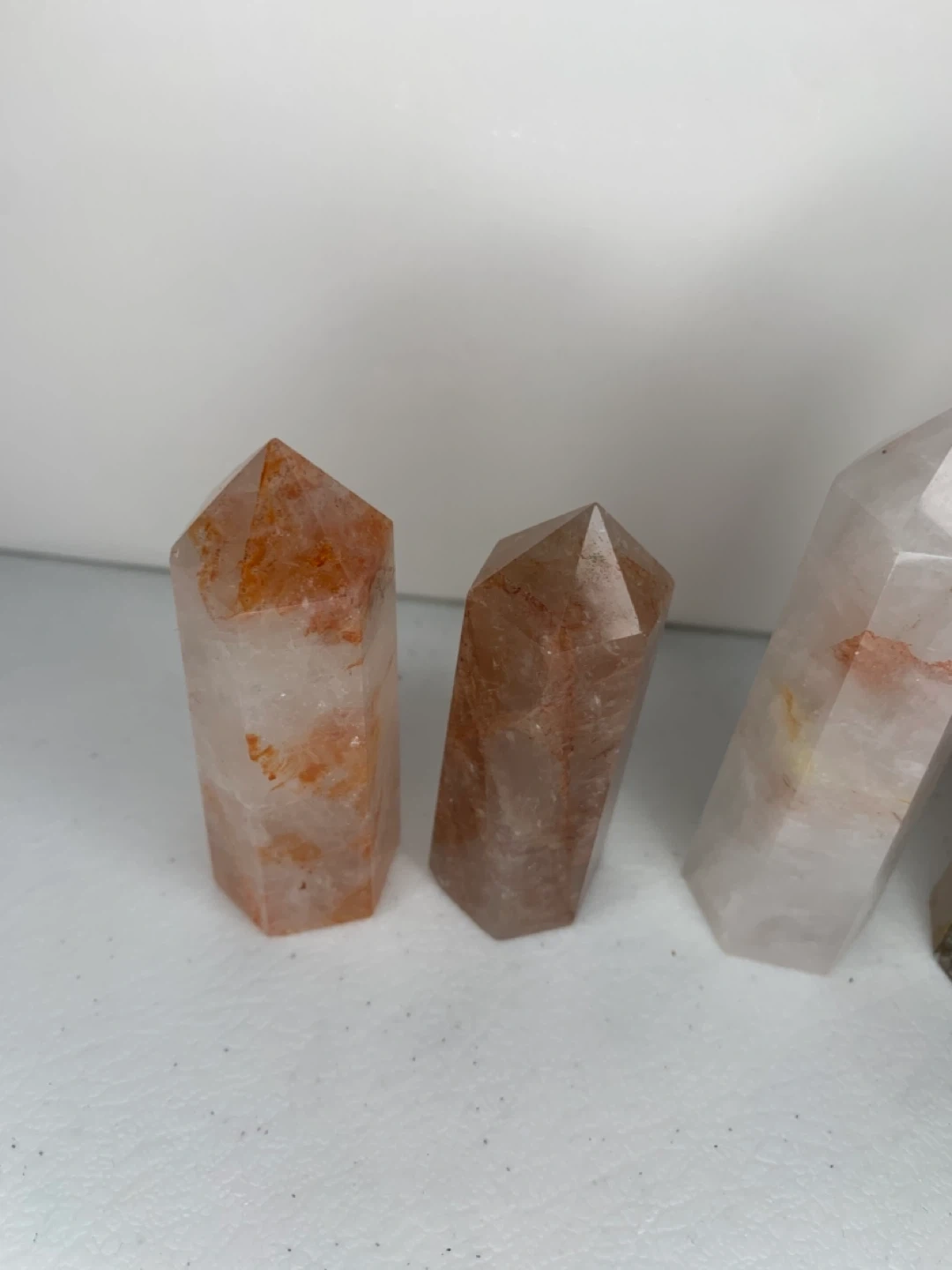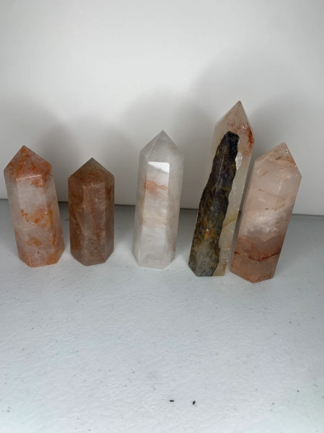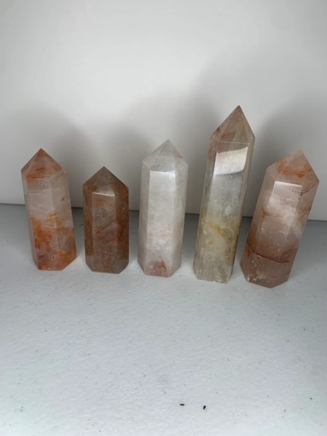 Selling a set of fire quartz crystal points! These are great for adding a touch of natural beauty to your home decor. They have a lovely translucent appearance with some reddish inclusions. Perfect for display or meditation