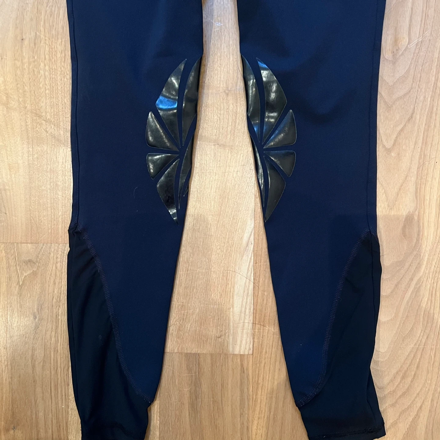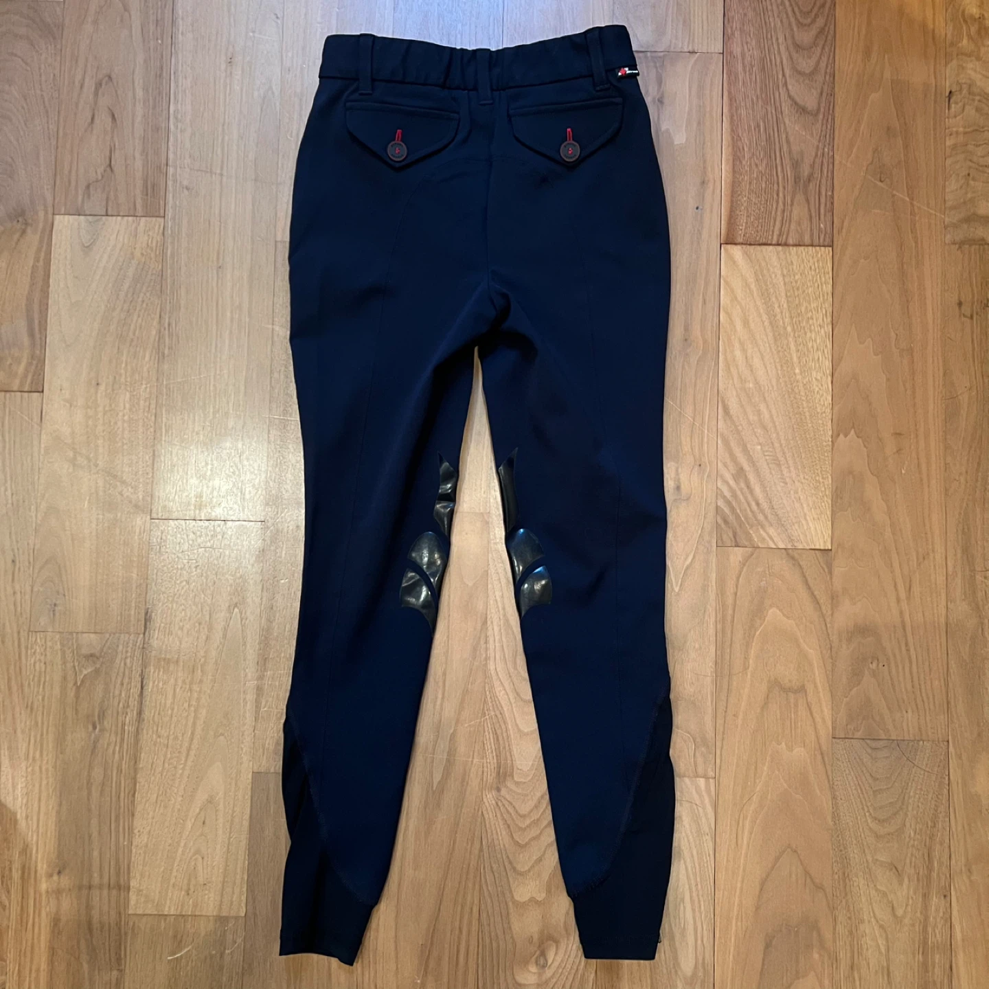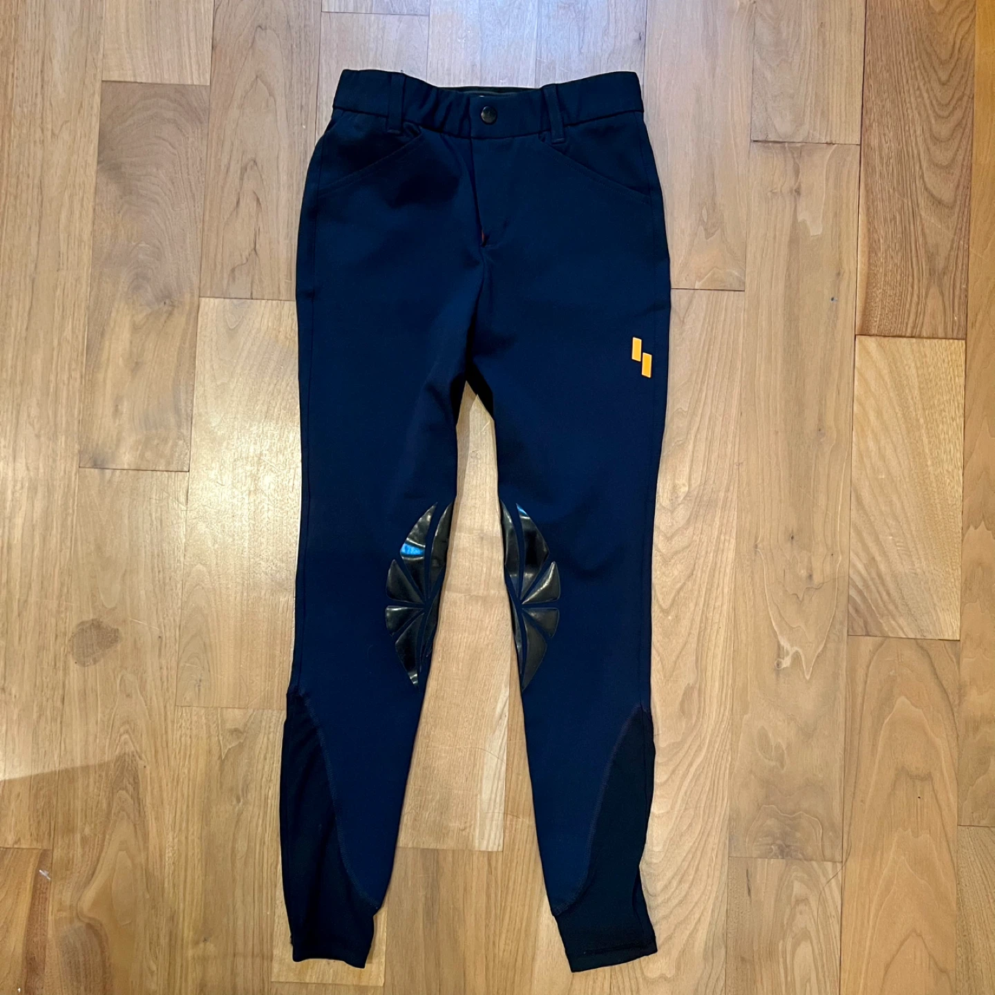 Struck 25 Series Boys Schooling Breeches in size 12. They're Navy blue with black knee patches and boot socks, and red stitching detail on the back pockets. Stylish and comfortable!