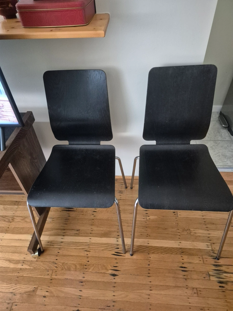 Selling a set of two simple black dining chairs. They have metal legs and a sleek, minimalist design. Perfect for a small dining area or kitchen!