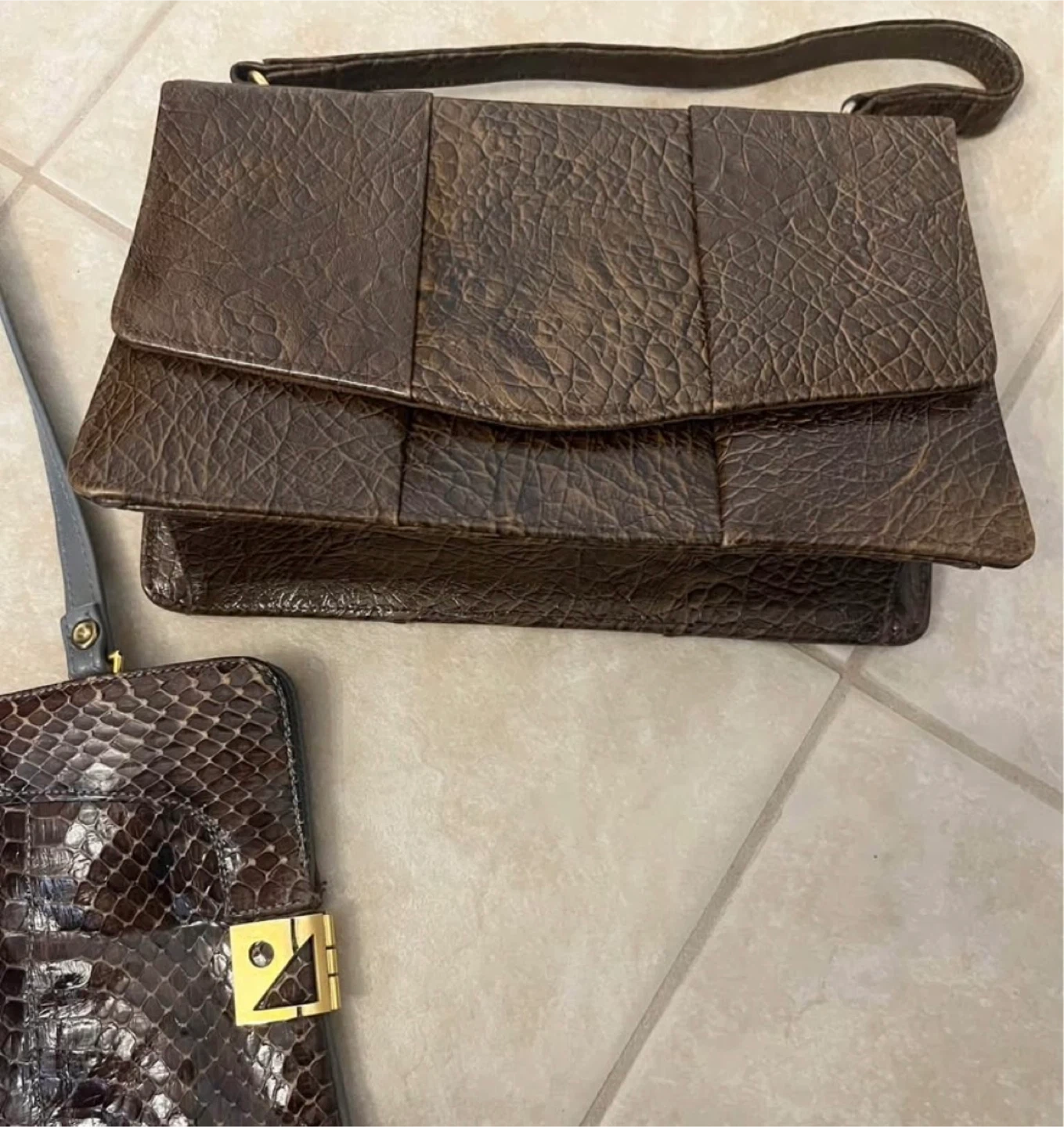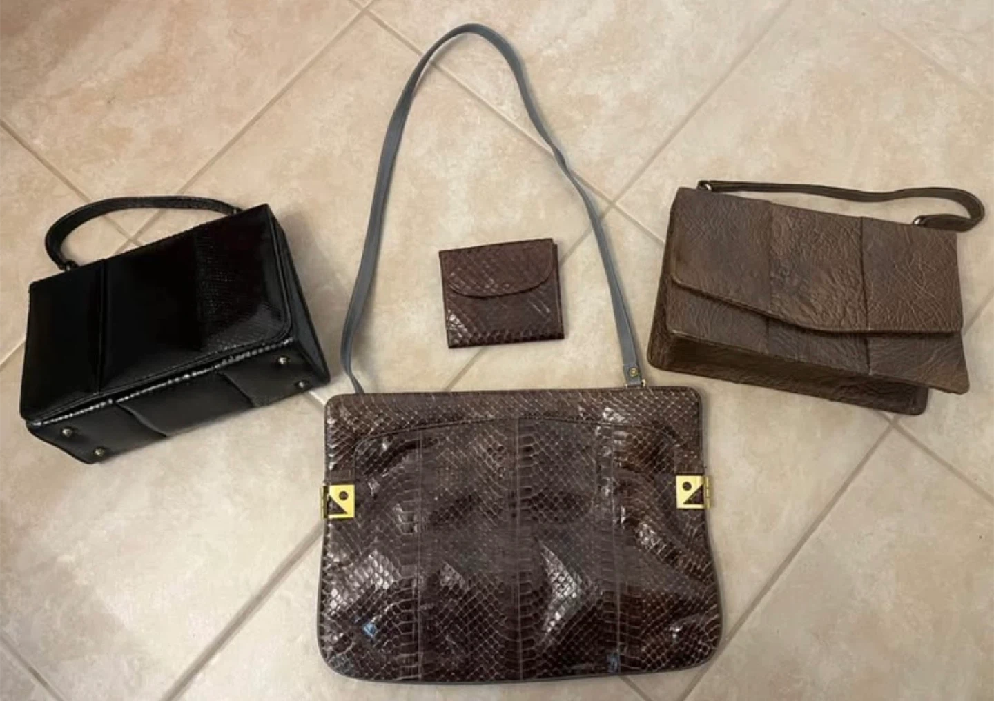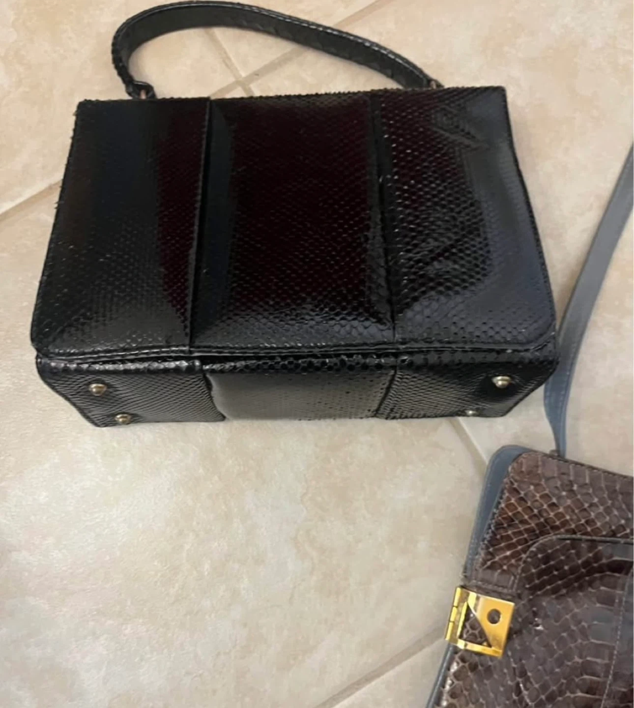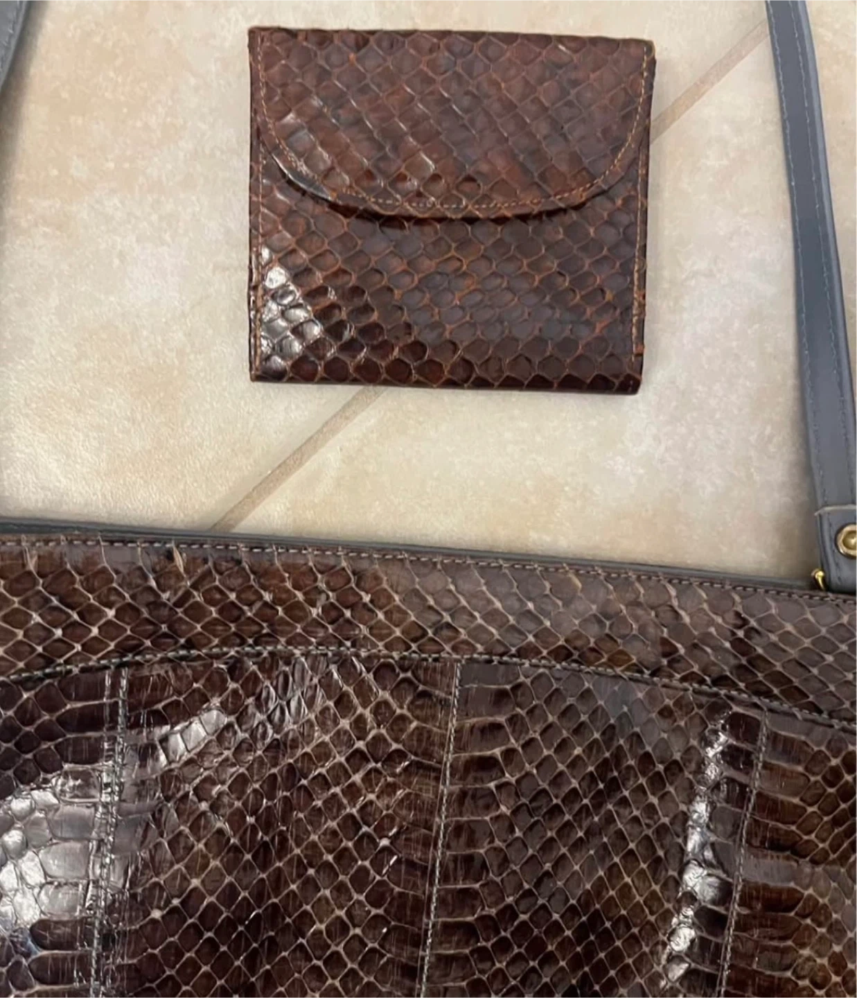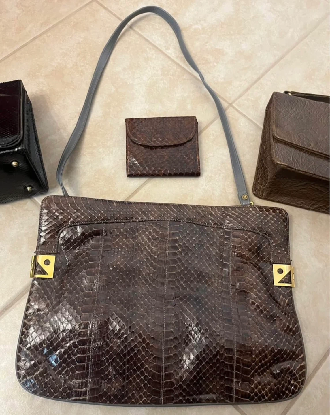 Selling a collection of vintage snakeskin handbags and a matching wallet. The set is in great condition and includes a black top-handle bag, a larger brown shoulder bag with gold accents, a smaller brown top-handle bag, and a small brown wallet. All items have a unique snakeskin texture, adding a touch of vintage charm to your wardrobe.
