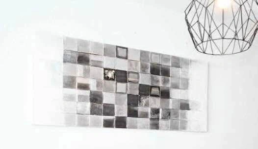 44Add a touch of modern art to your space with this abstract wall piece! It features a mosaic of silver and grey squares, creating a unique and eye-catching design. Perfect for living rooms, bedrooms, or offices. Dimensions: 28" x 60"