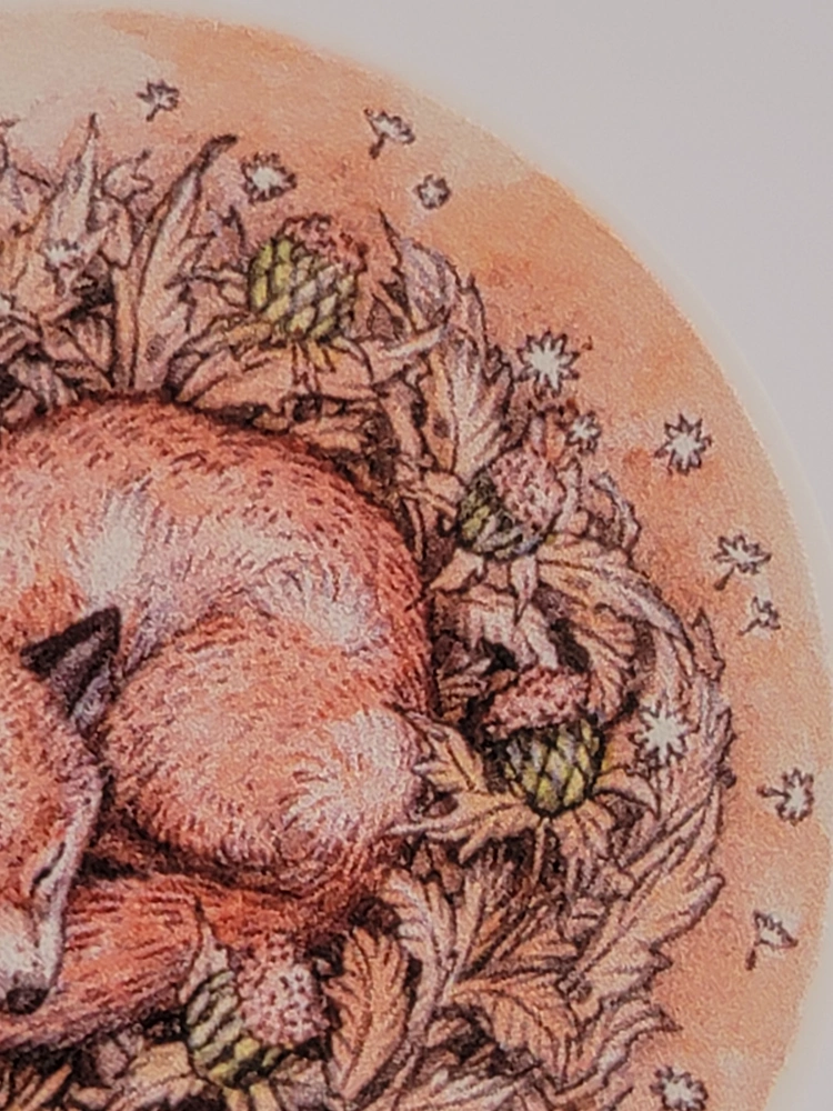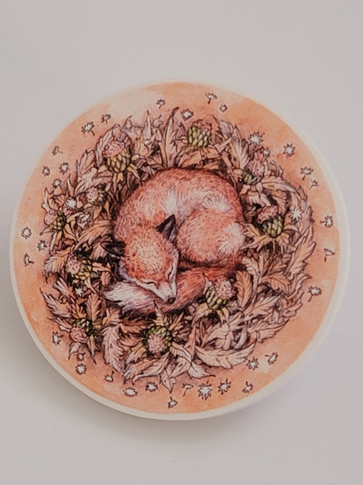 Here's a cute fox pin! It features a fox sleeping nestled in leaves and thistles. The pin has a white backing. Open to negotiating the price; please reach out. Thank you for taking a look at my listing! Have a wonderful day.
