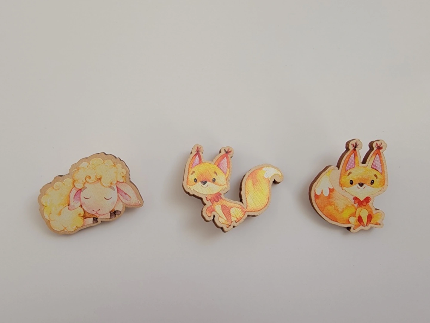 Selling these adorable wooden pins! They feature a cute fox and a fluffy sheep design. Perfect for adding a touch of whimsy to your jacket, backpack, or hat. They are in great condition and ready for a new home! Open to negotiating the price; please reach out. Thank you for taking a look at my listing! Have a wonderful day.