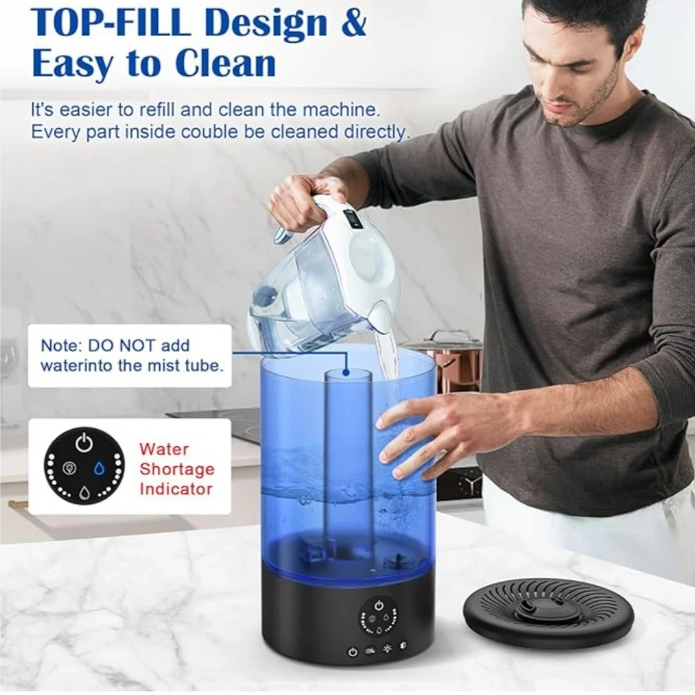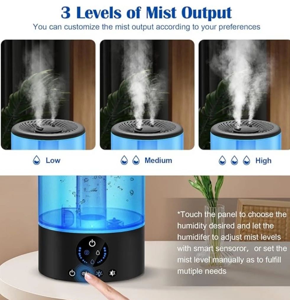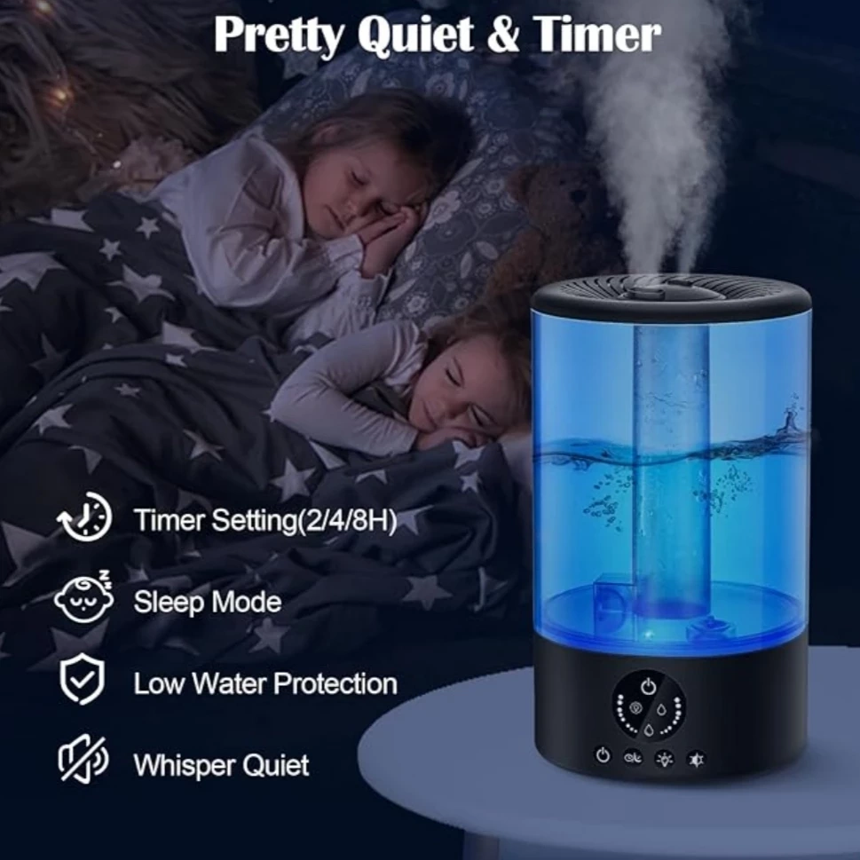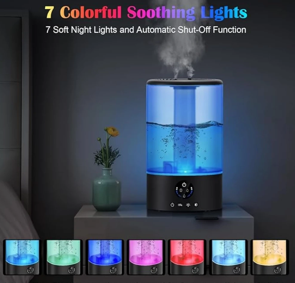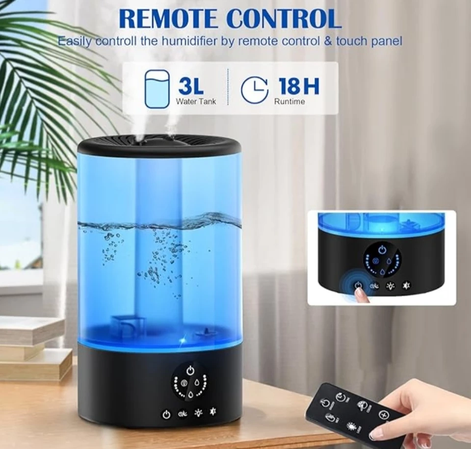 This humidifier features a 3L water tank and can run for up to 18 hours. It comes with a remote control for easy adjustments and also has a touch panel. Key features include: - Timer setting (2/4/8H) - Sleep mode - Low water protection - Whisper quiet operation It also has 3 levels of mist output and 7 colourful soothing lights