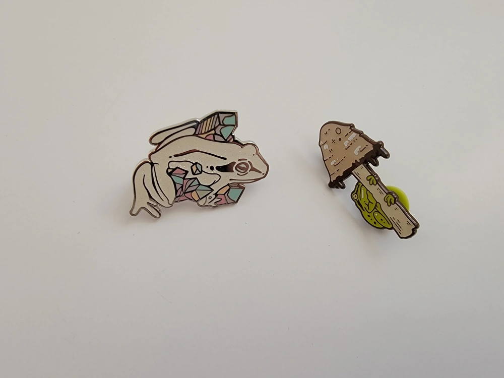 Two cute enamel pins up for grabs! One is a white frog with geometric details, and the other features a green frog climbing a mushroom. Both are in great condition and ready to add some flair to your jacket, bag, or pin collection.