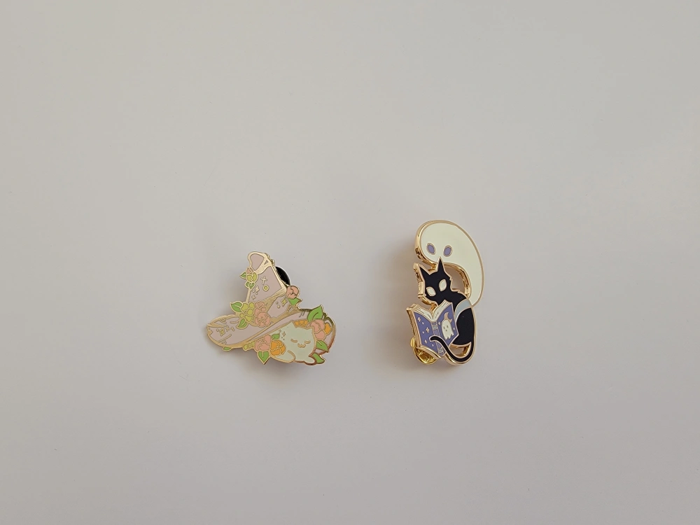 I'm selling two adorable enamel pins! One is a cute cat under a witch hat with flowers, by Clivenzu. The other is a black cat reading a book with a ghost behind it, by Lisa LaRose. They're both in great condition and would look super cute on a jacket or bag. The two pins are both glow in the dark. Open to negotiating the price; please reach out. Thank you for taking a look at my listing! Have a wonderful day.