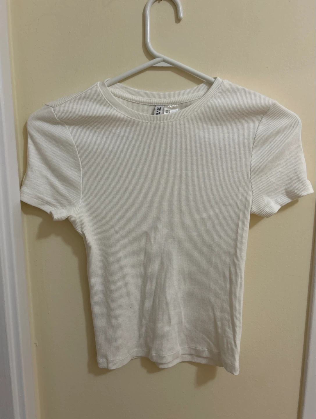 Selling a white ribbed t-shirt from H&M's Divided line in size small. Selling because it is a little small for me. Still white, no marks or deodorant patches.