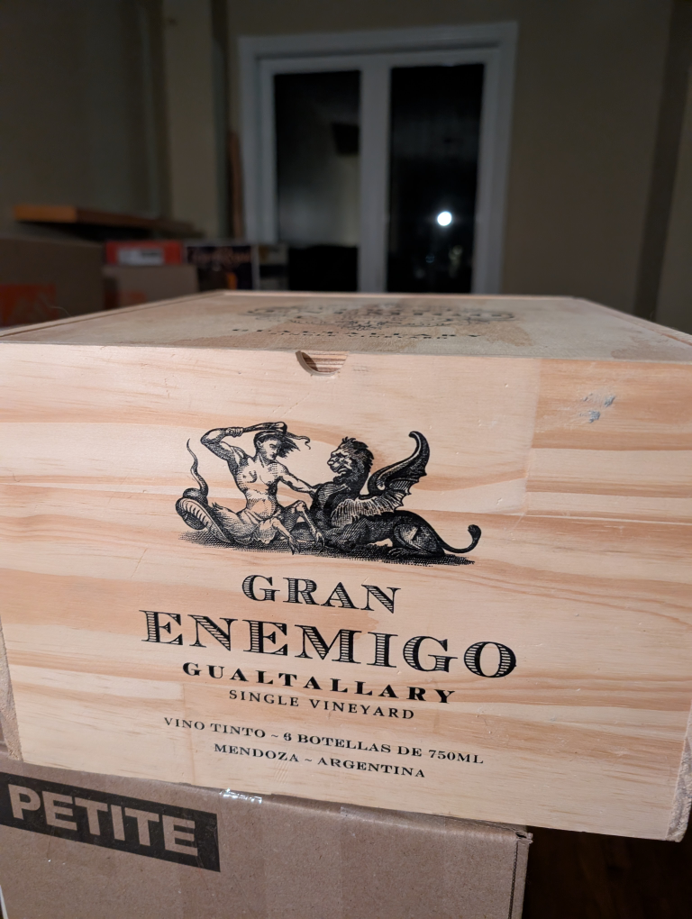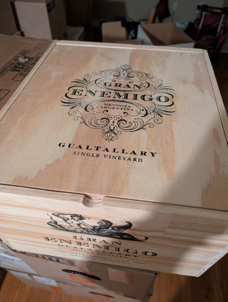 Selling a wooden wine box from Gran Enemigo. It's a nice decorative piece. The box originally held 6 bottles of 750mL wine from Mendoza, Argentina. Lovely fresh wood aroma.