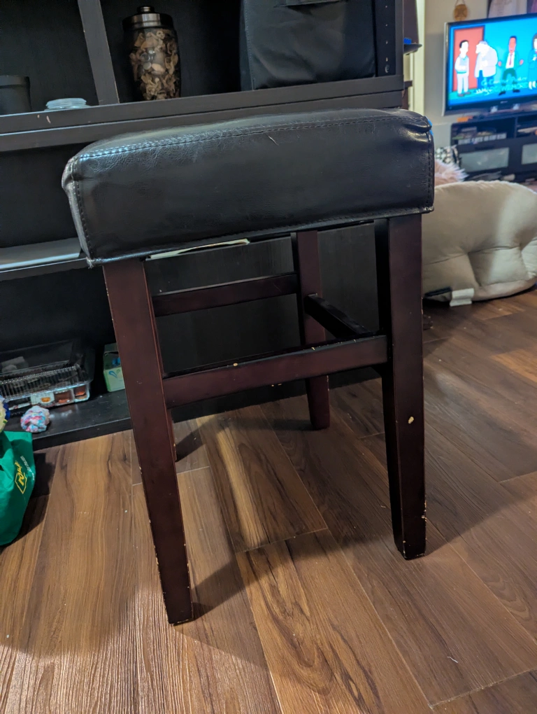 Selling a brown bar stool with a padded seat. It's in good condition and would be a great addition to any kitchen, It has a dark brown leather seat and dark brown wooden legs. Perfect for adding extra seating to your space