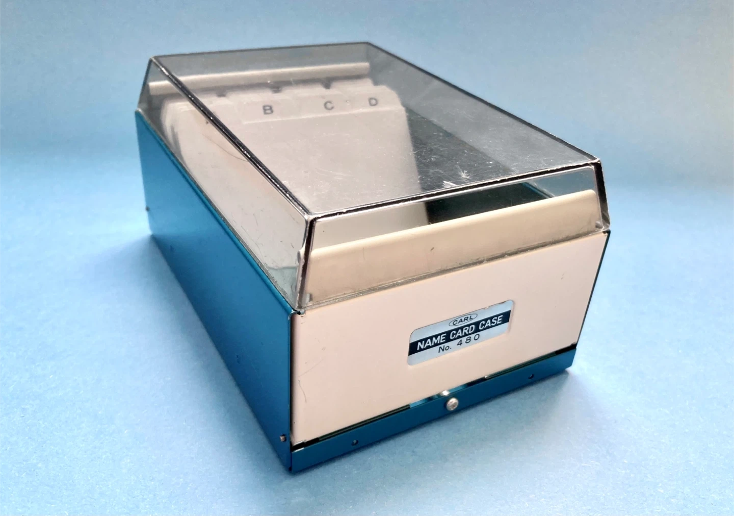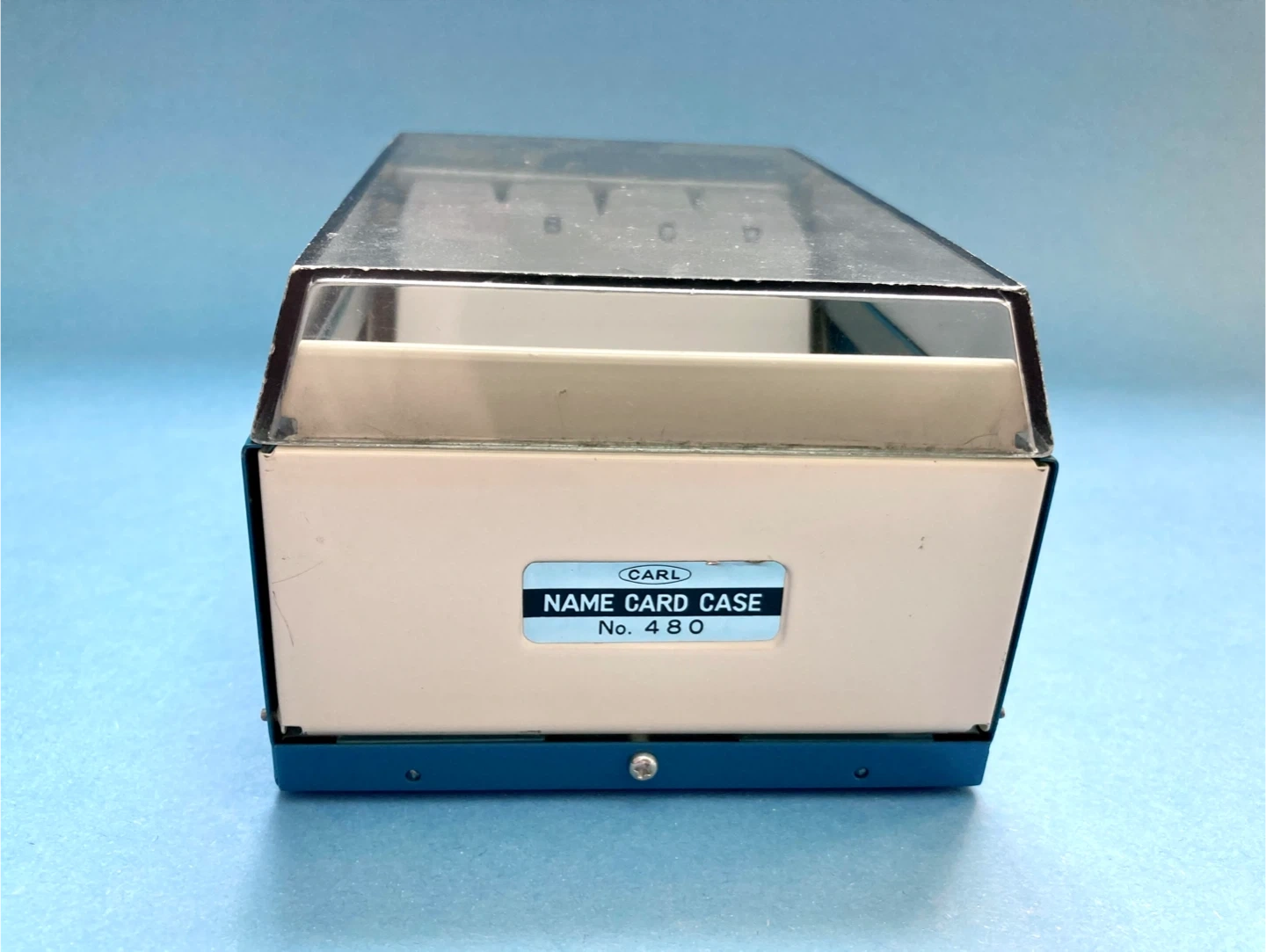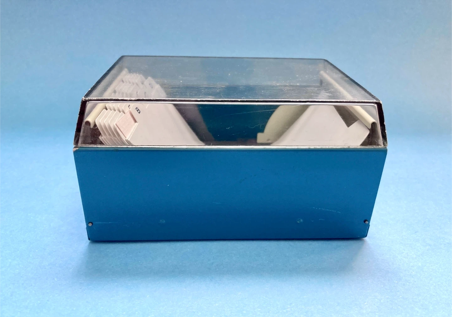 Vintage 1980s business card file. Very cool industrial metal box in blue and beige and a smoky grey plastic lid. Panels in the front and back fold down to allow more cards, or better access to the cards. All the original alphabetic dividers are included. There are some signs of wear consistent with age, but in generally very good vintage condition. Pick up in the Ossington and Davenport area. Please check my other listings for more vintage housewares and occasional office supplies.
