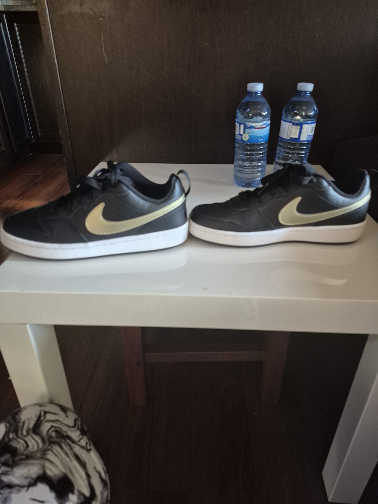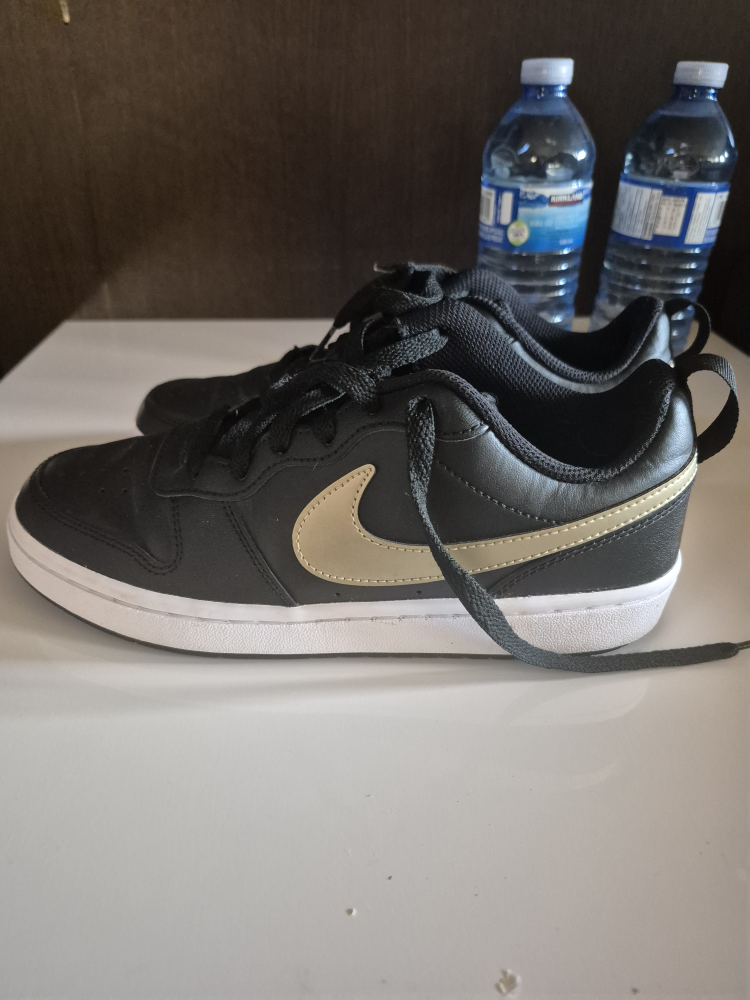 Selling a pair of Nike Court Borough Low 2 sneakers in black with gold swoosh. They are youth size 6Y, which is equivalent to a women's size 7.5. Worn few times. Paid 170 dollars. Asking for 50 dollars.