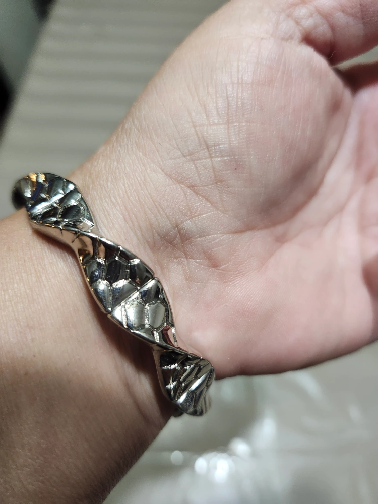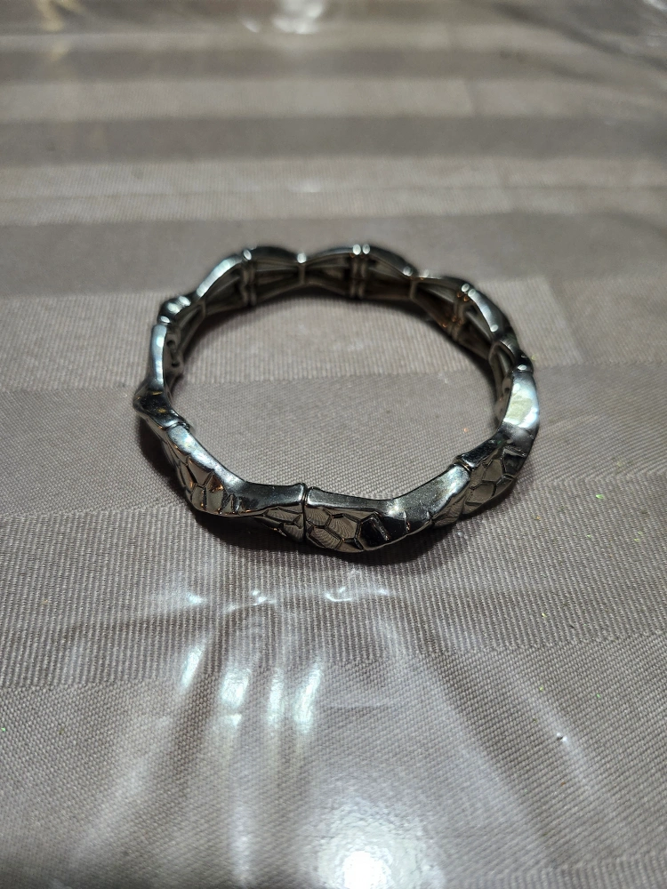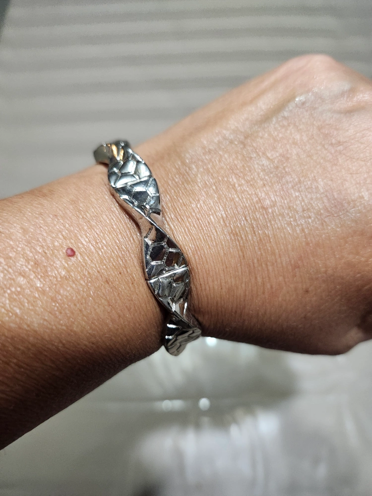 Selling a silver tone bangle bracelet! It has a unique twisted design. Perfect for adding a bit of style to any outfit!