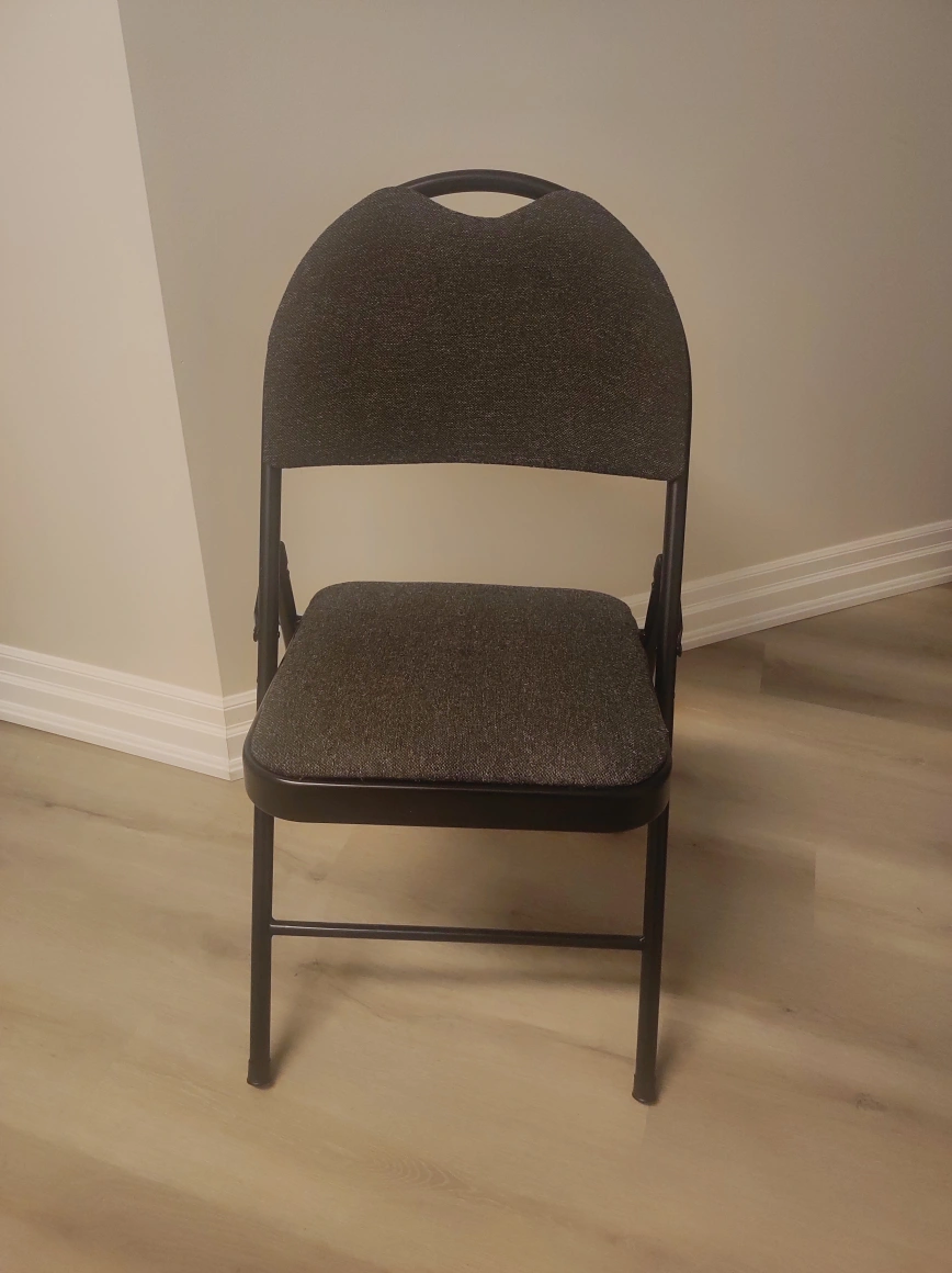 Selling a folding chair with a grey fabric seat. It's in great condition and perfect for extra seating when you have guests over. Folds up easily for storage when not in use