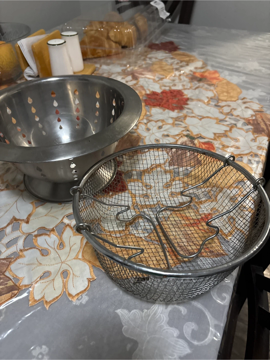 Selling a stainless steel colander and fry basket. Both are in good condition and ready for a new home. Perfect for draining pasta or frying up some delicious treats!