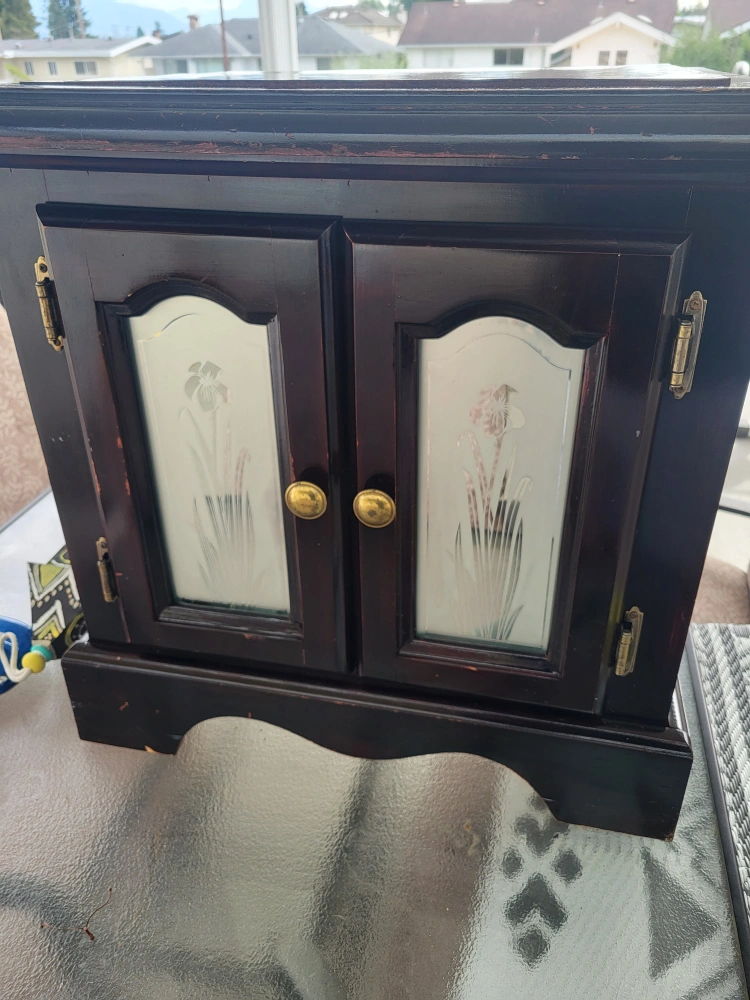 Selling a cute little dark brown cabinet. It has glass doors with a flower design on them. It would be perfect for storing small items or displaying collectibles. There are some signs of wear and tear, as shown in the photos, but it's still a charming piece!