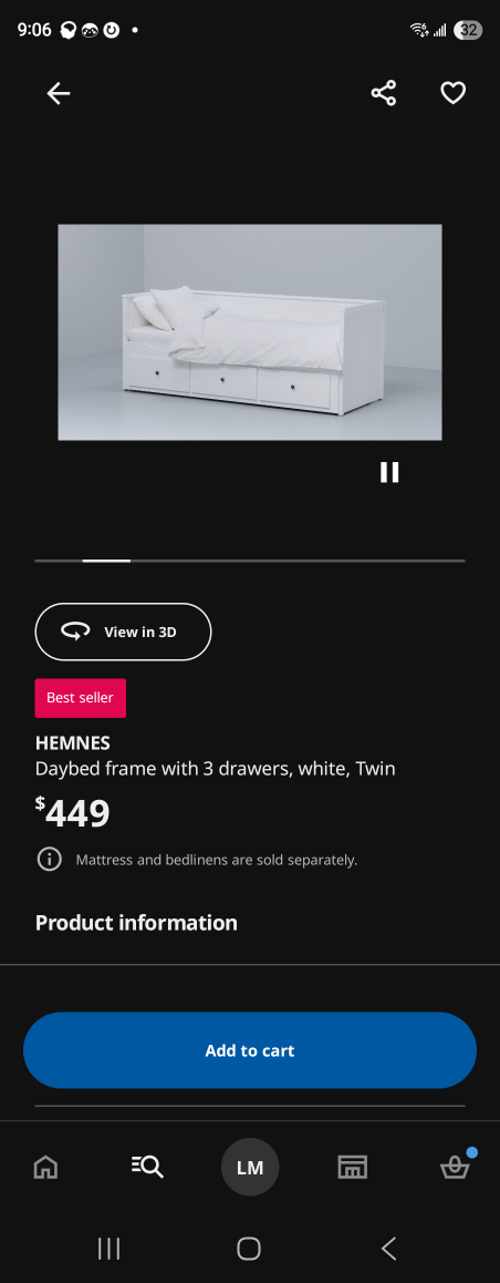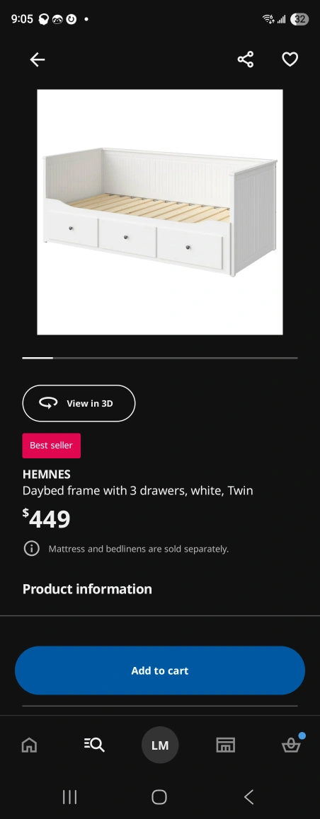 Selling an IKEA Hemnes daybed frame in white! It comes with three drawers, perfect for extra storage. Please note that the mattress and bed linens are sold separately. Originally bought for $449.