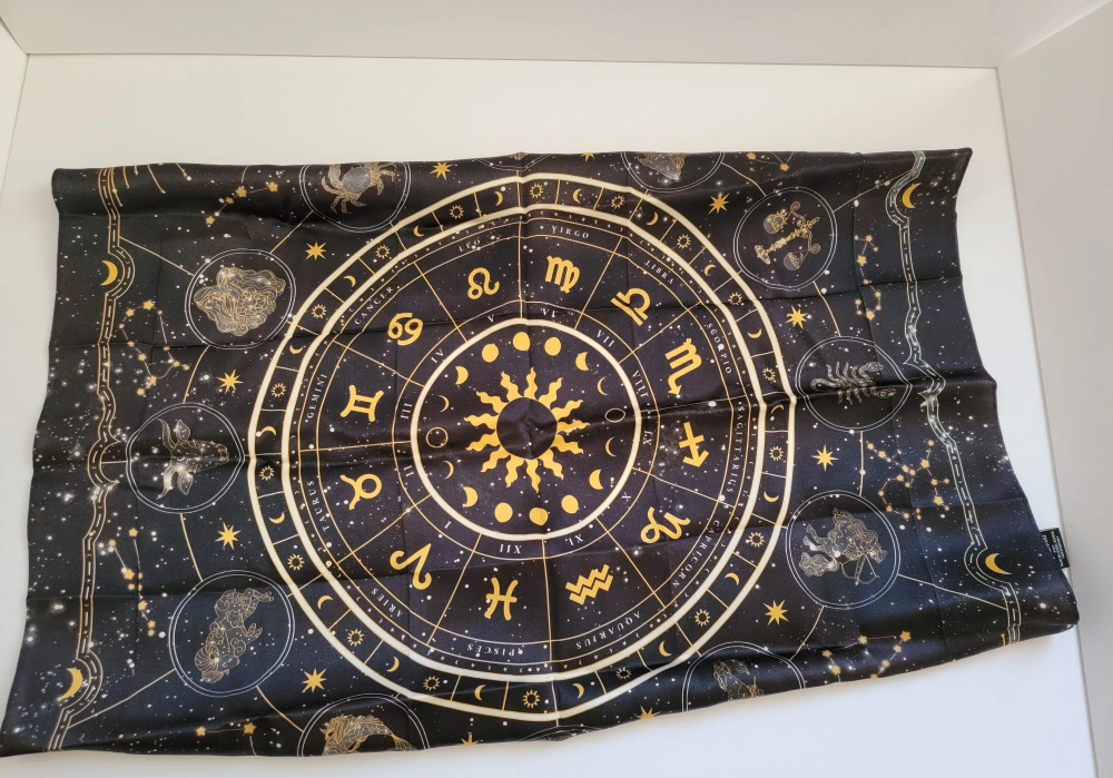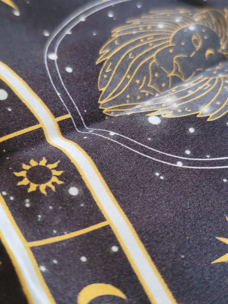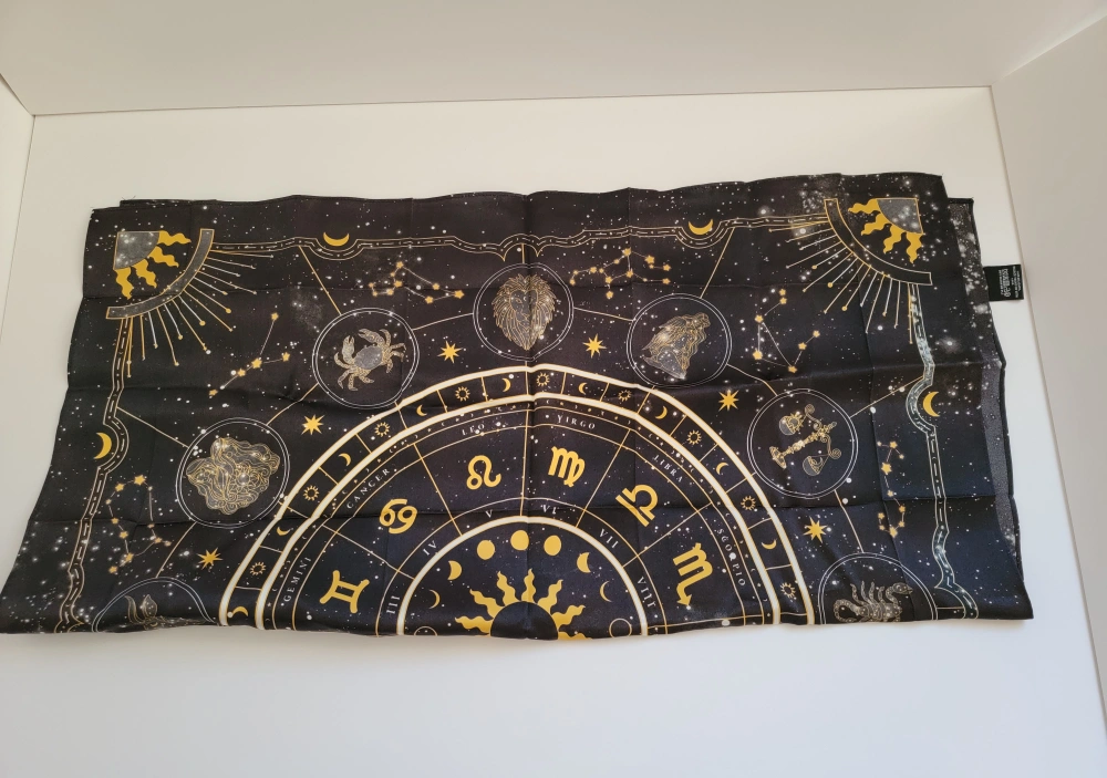 Add a touch of celestial charm to your wardrobe with this scarf from The Quirky Cup Collective! The scarf features a beautiful zodiac design in gold on a black background. It's in great condition and ready to find a new home. Please treat it with love as it is delicate and dry clean only.
