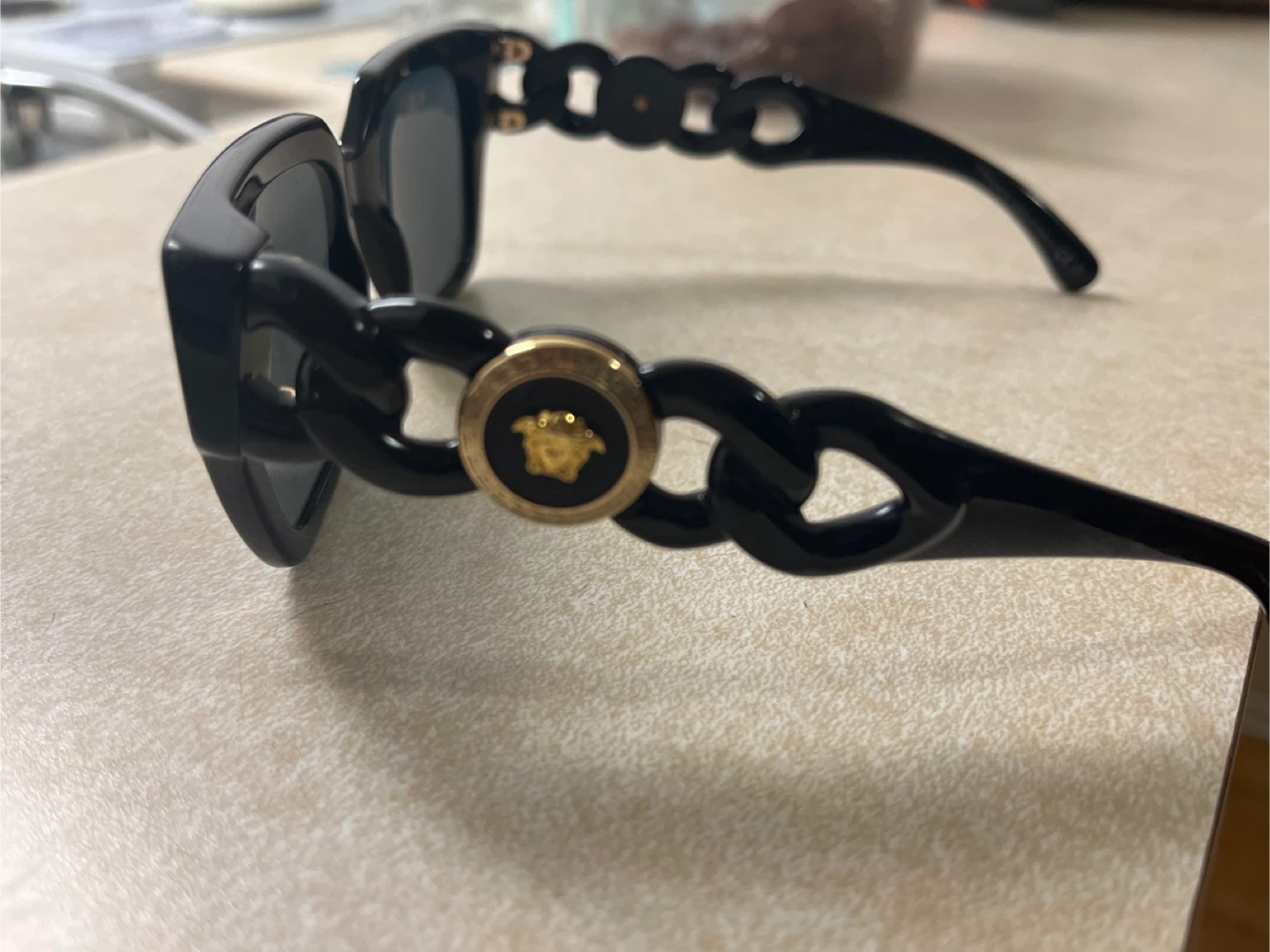 Selling a pair of Versace sunglasses in black. They have a unique chain design on the sides with the Versace Medusa logo. Perfect for adding a touch of luxury to your style!