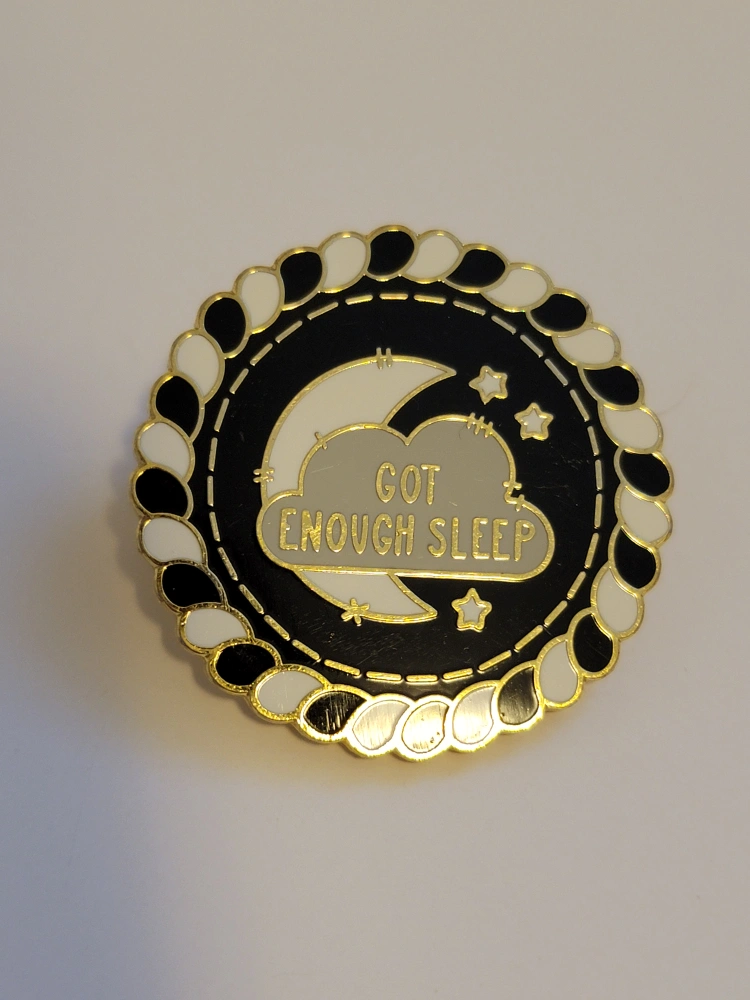 Selling a cute Mia Mouz pin that says 'Got Enough Sleep'! It features a moon and stars design with a black and white border. Perfect for adding a bit of flair to your jacket or bag.
