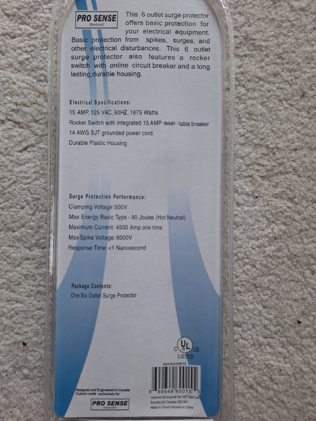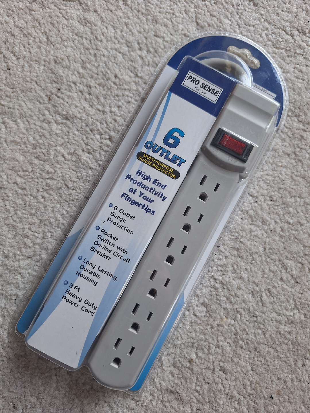 Selling a brand new Pro Sense 6 outlet surge protector! - 6 outlet surge protection - Rocker switch with on-line circuit breaker - Long lasting, durable housing - 3 ft heavy duty power cord Electrical Specifications: - 15 AMP, 125 VAC, 60HZ, 1875 Watts - Rocker switch with integrated 15 AMP reset-table breaker - 14 AWG SJT grounded power cord - Durable plastic housing