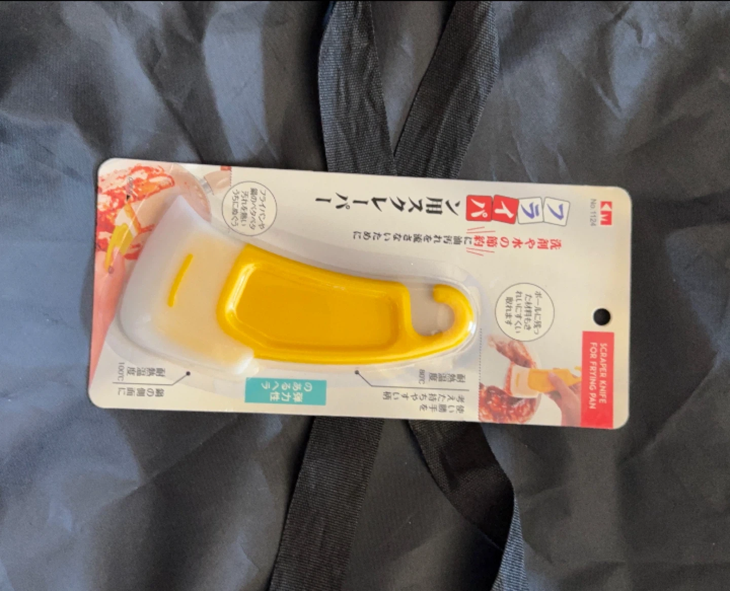 This is a scraper knife for frying pans! It helps to clean up oil and food residue from your frying pan. It can also help save water and detergent by removing oil stains before washing. It has a heat resistance of 100°C and is designed to be easy to hold and use