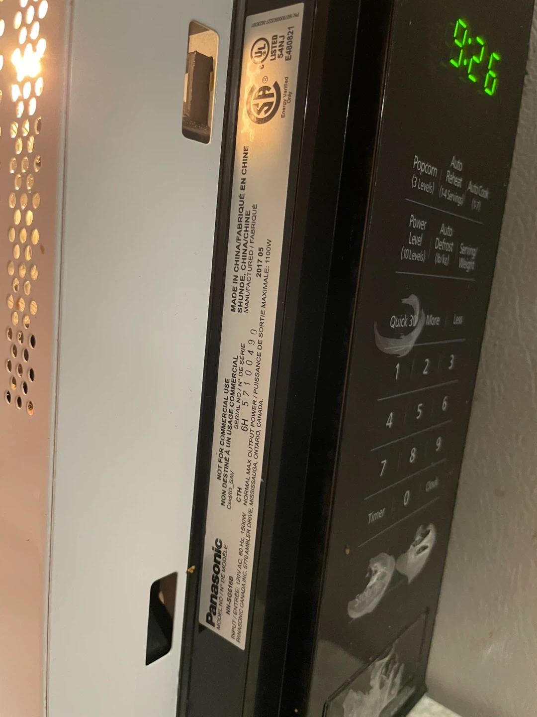 Features include quick 30-second start, auto defrost, and power level adjustments. Model number is NN-SG616B