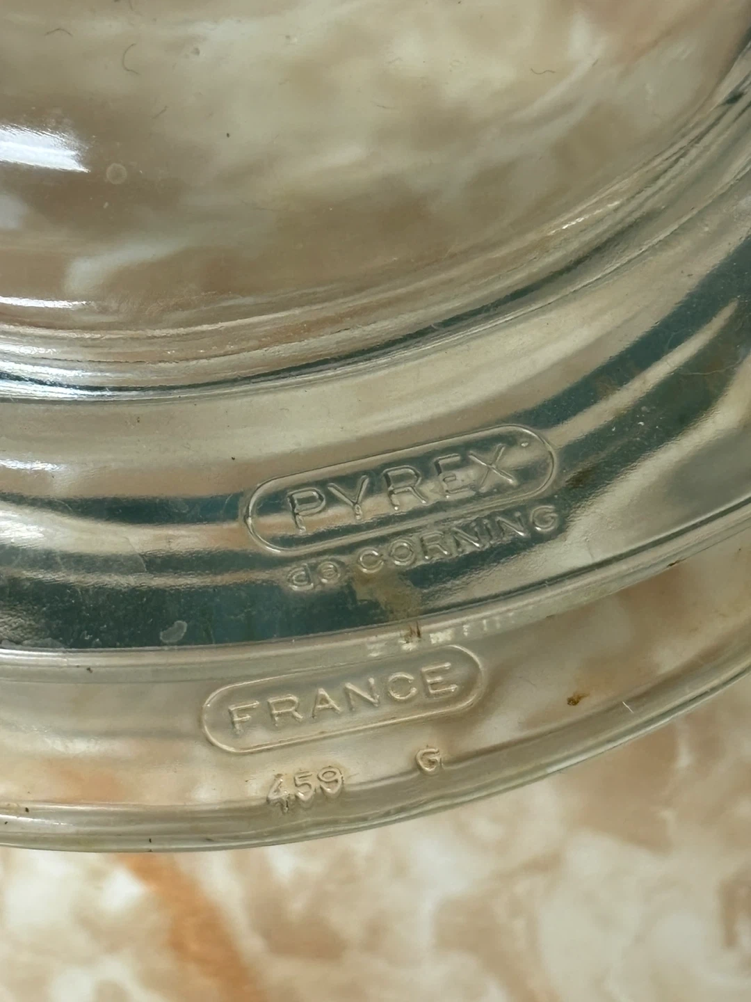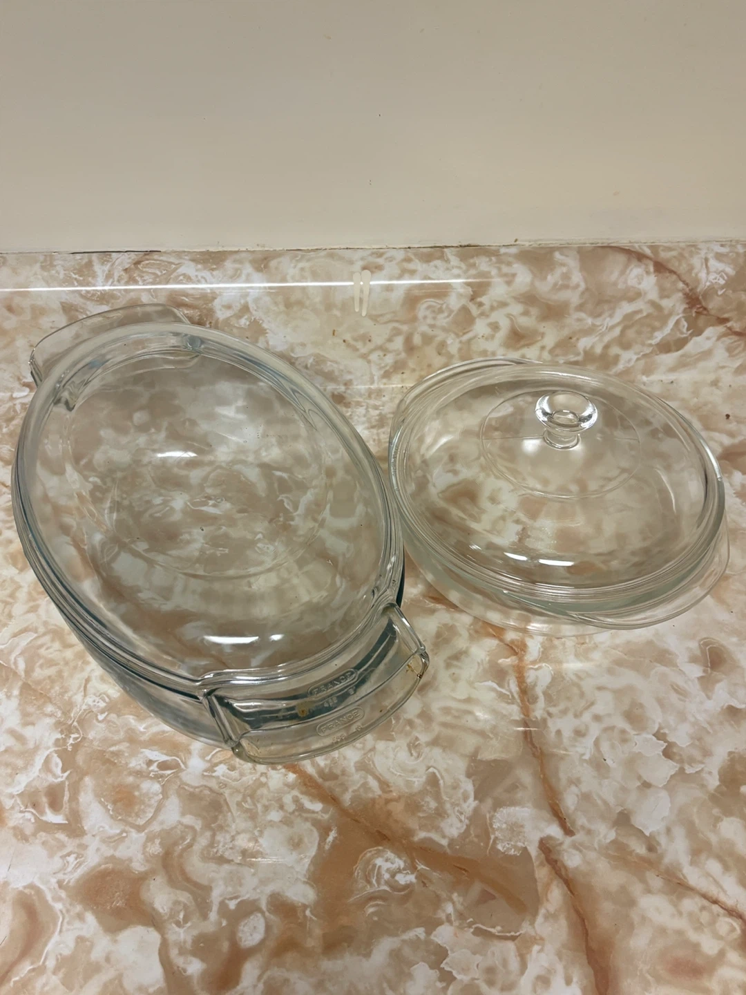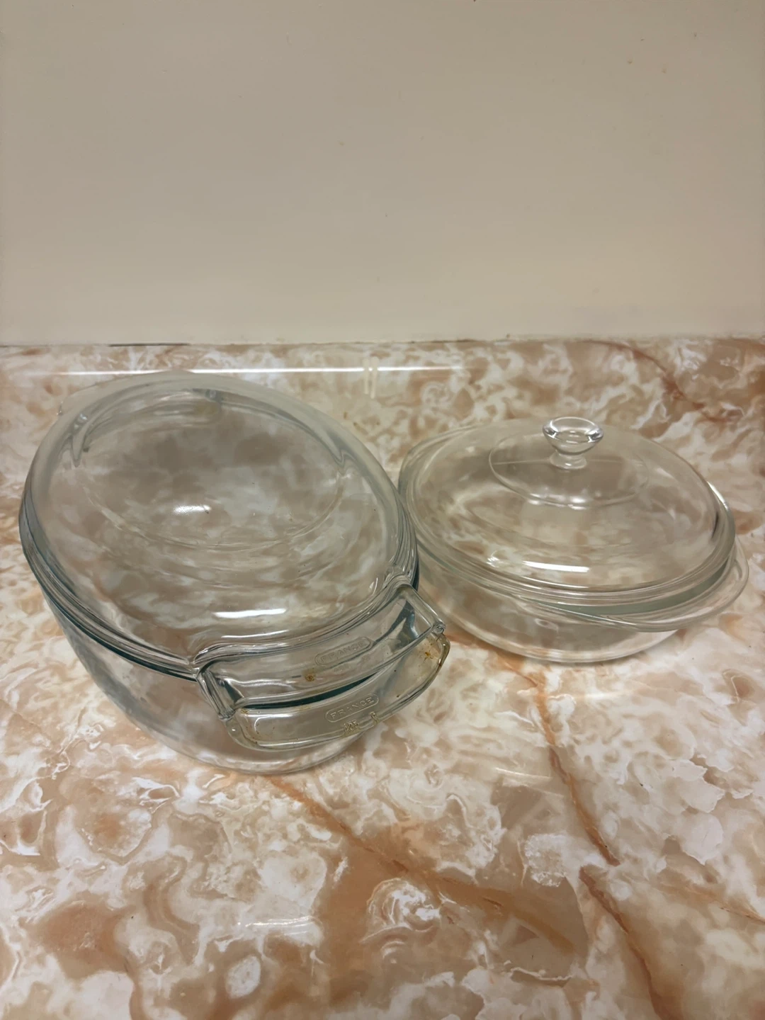Selling two vintage Pyrex casserole dishes. One is oval-shaped with handles (Made in France), and the other is round with a lid knob (Made in USA).