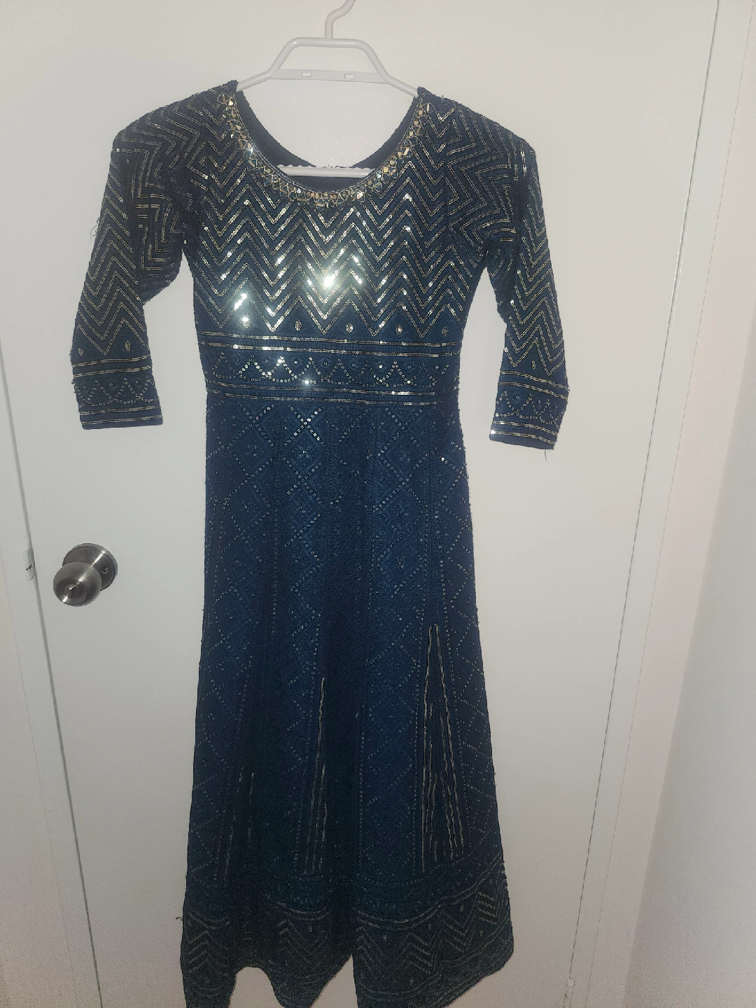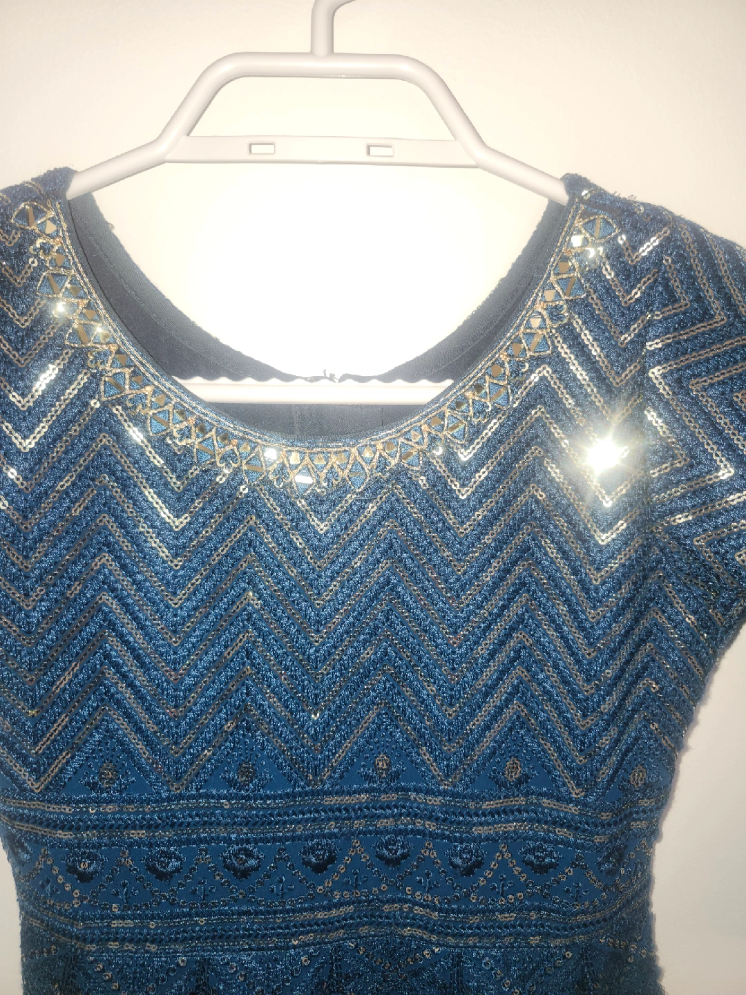 Beautiful blue teal dress with intricate embellishments! It's perfect for parties or special occasions. The dress features a unique zigzag pattern with subtle sequins that catch the light beautifully. It's in great condition and ready for a new home!