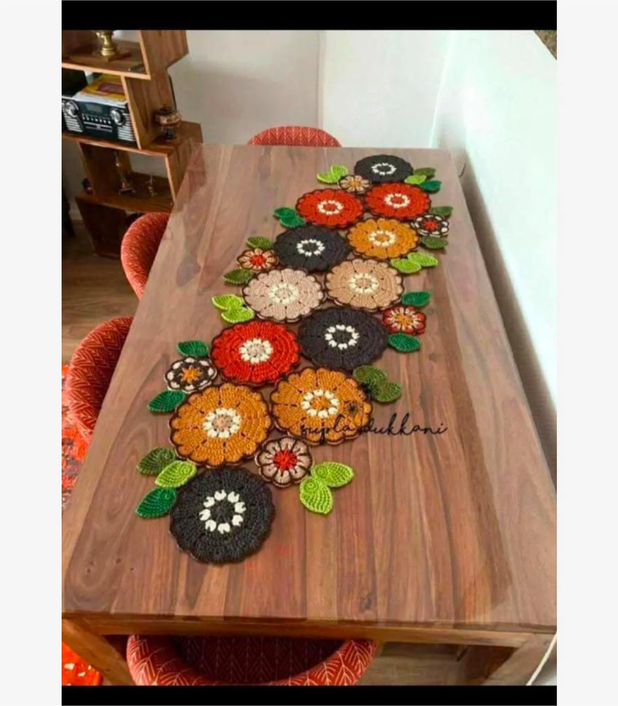 Selling a beautiful, handmade crochet table runner with a floral design. It features a variety of colourful flowers and green leaves, perfect for adding a touch of charm to your dining table or any surface in your home! It's in great condition and ready to brighten up your space