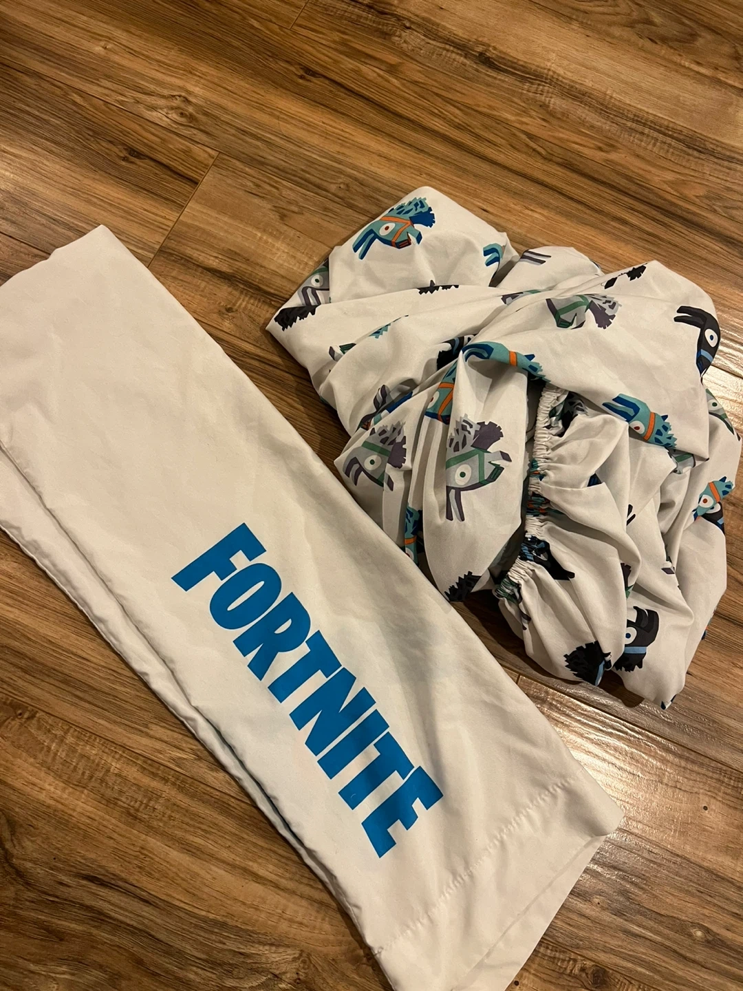 Selling a Fortnite bed sheet set! It includes a fitted sheet and a pillowcase, both featuring designs from the popular game. Perfect for any young Fortnite fan's bedroom