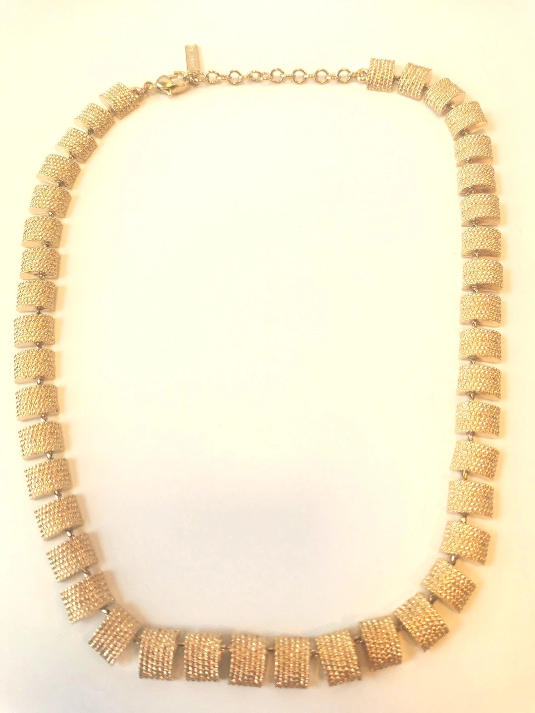 This is a vintage Napier goldtone choker necklace featuring small linked squares. The necklace is made of yellow gold plated metal, with a gold color scheme. It exudes a classic and timeless style that can be a versatile addition to any jewelry collection. Good vintage condition light wear please reference photos as part of description.