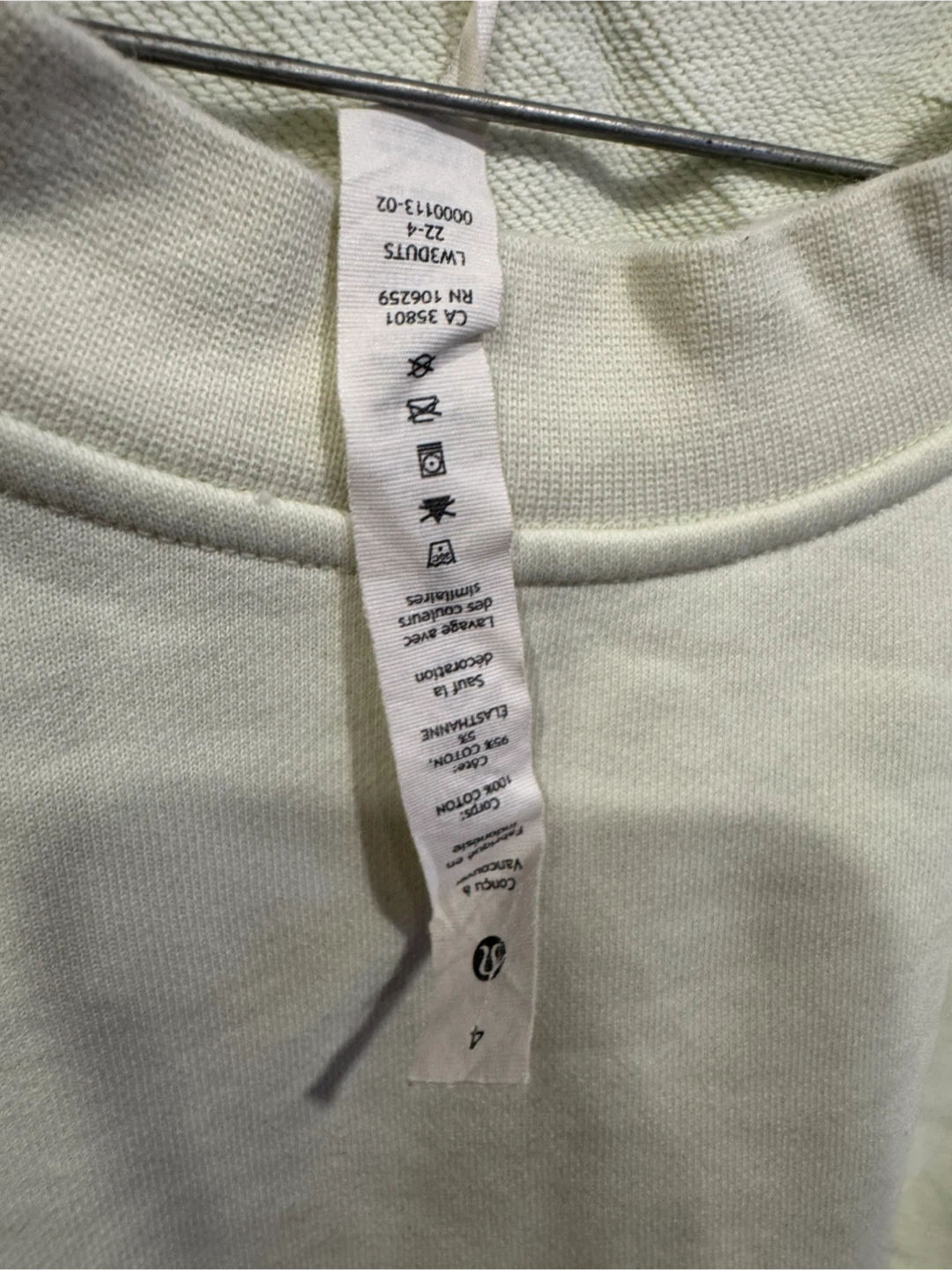 55Selling a Lululemon crewneck sweatshirt in size 4! It is a light green colour and made of 100% cotton. Super comfy and in great condition!