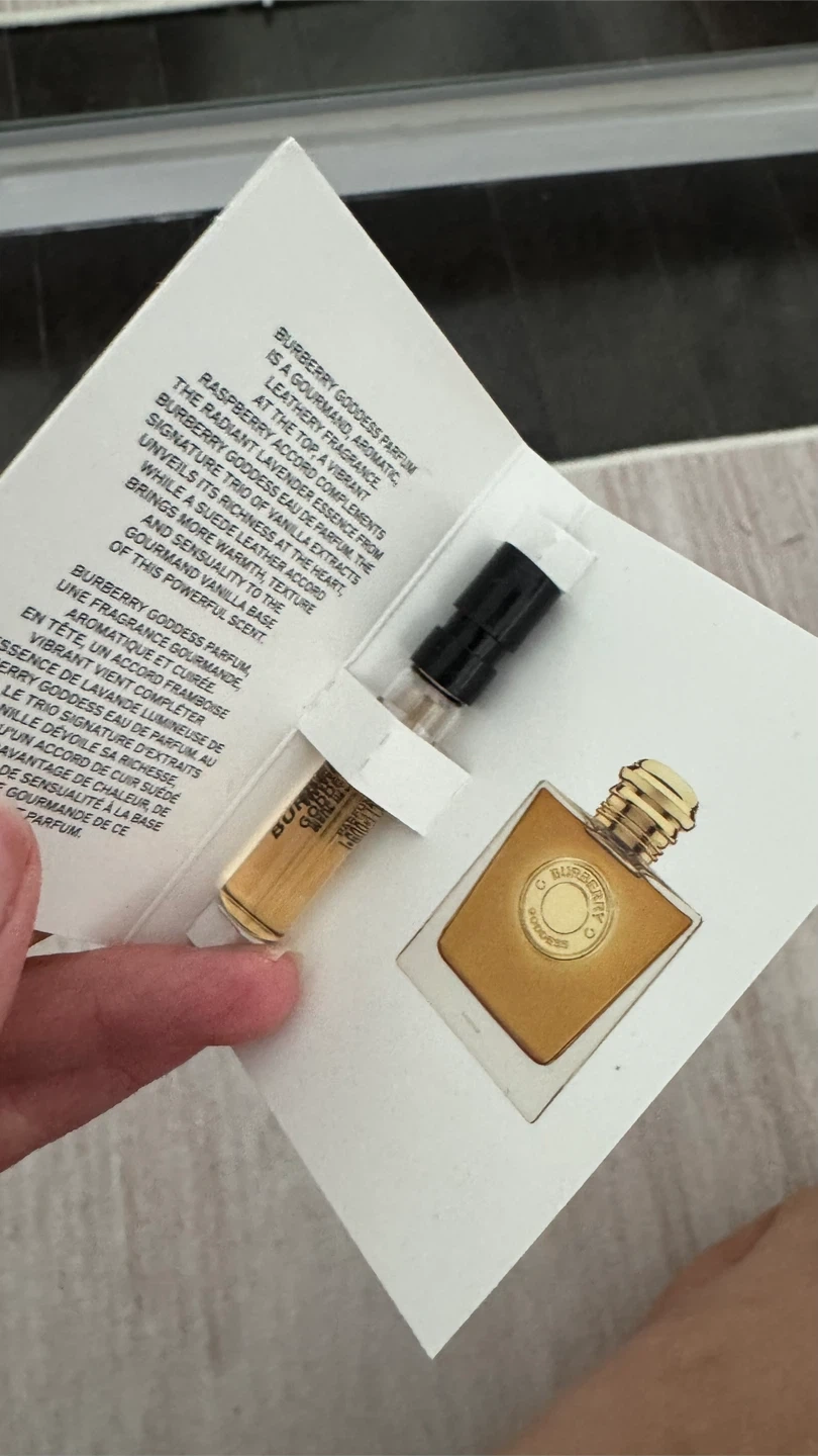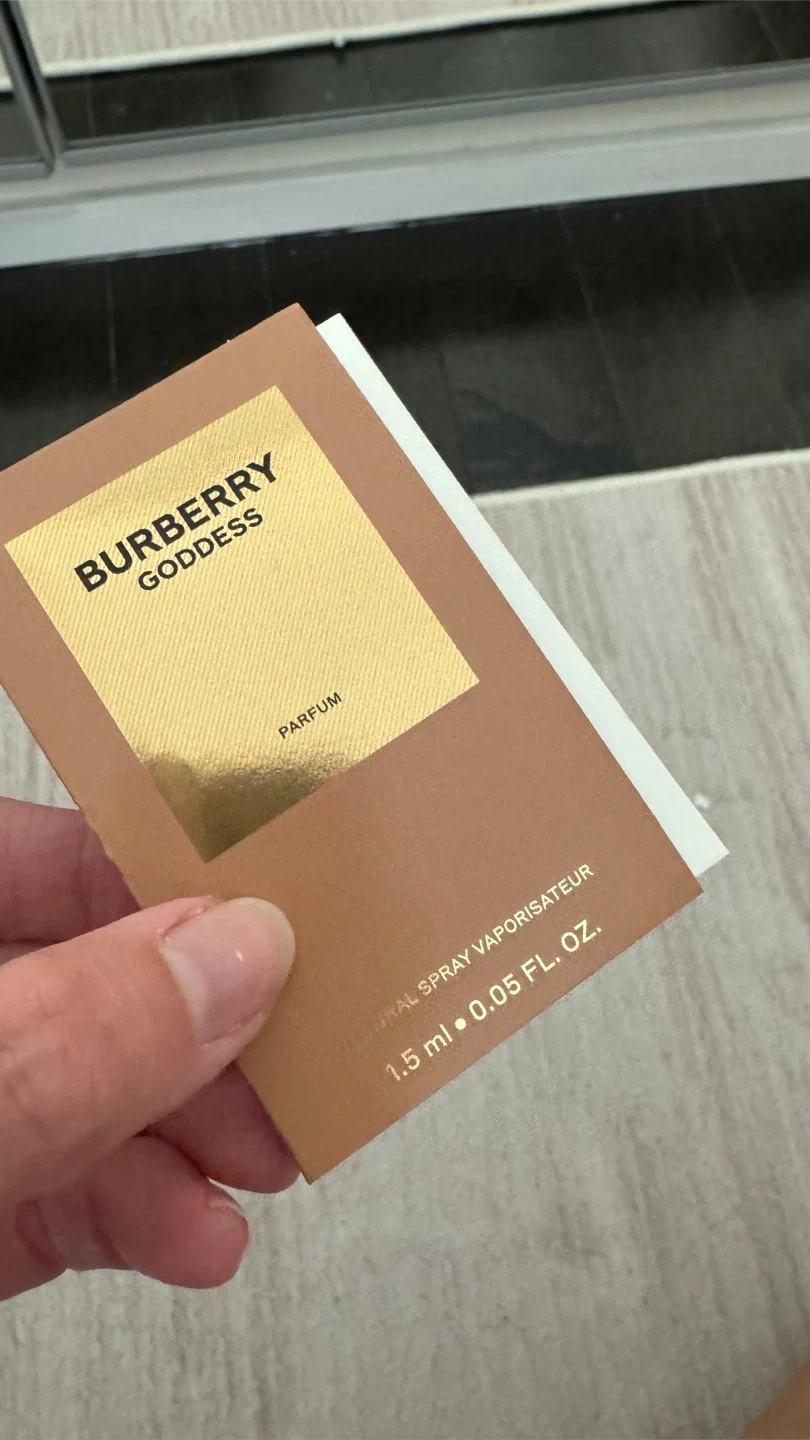 Selling a sample size of Burberry Goddess Parfum. It's a gourmand aromatic fragrance with notes of vanilla, lavender, and leather. The sample contains 1.5 ml / 0.05 fl oz