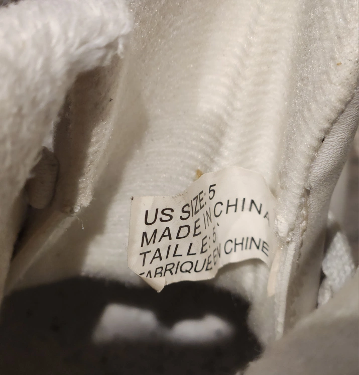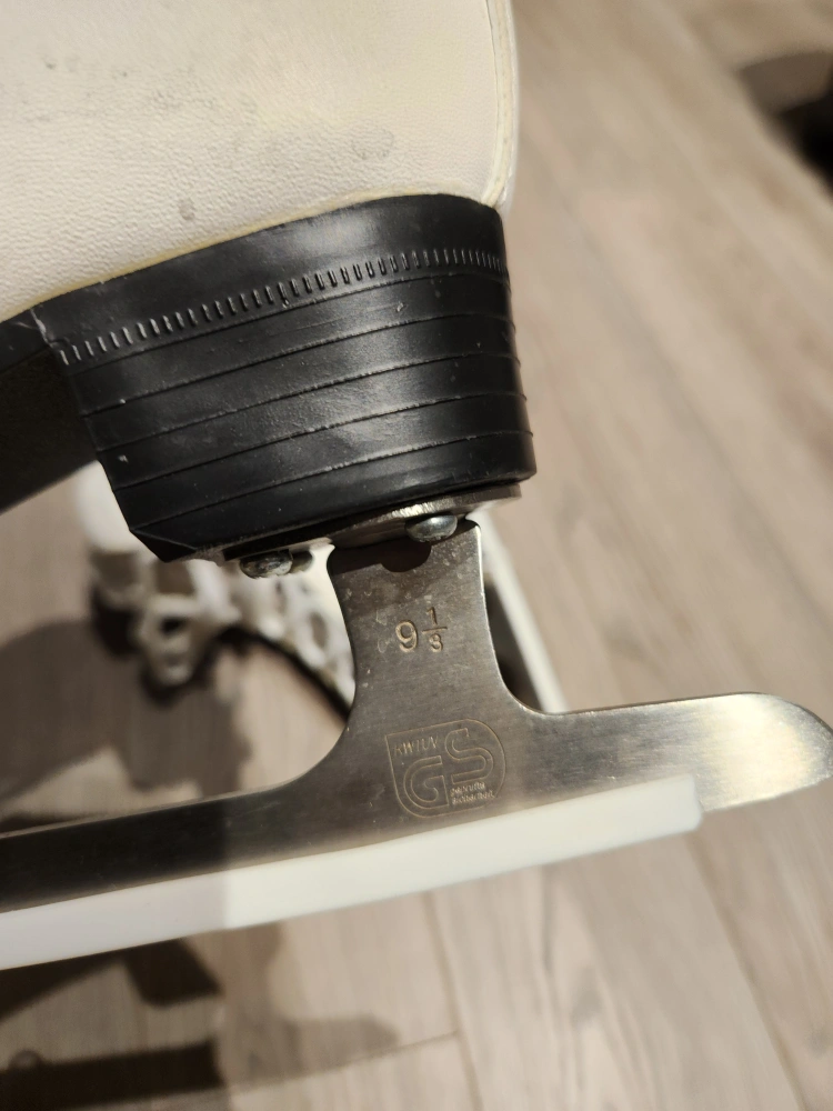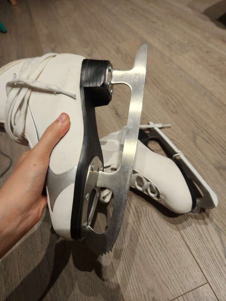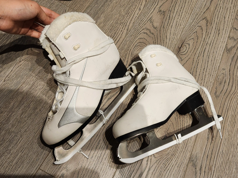 Selling a pair of white figure ice skates. They are in good condition and are a US size 5. The blades are marked with a 9 1/3. A backpack to carry the skate provided for free.