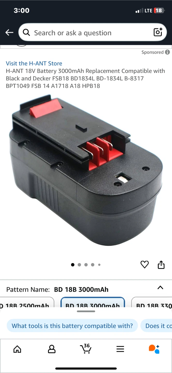 Selling a H-ANT 18V 3000mAh replacement battery compatible with Black and Decker power tools. It fits models FSB18, BD1834L, BD-1834L, B-8317, BPT1049, FSB 14, A1718, A18, and HPB18