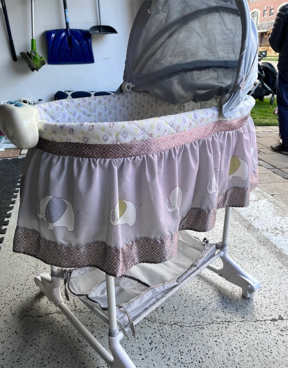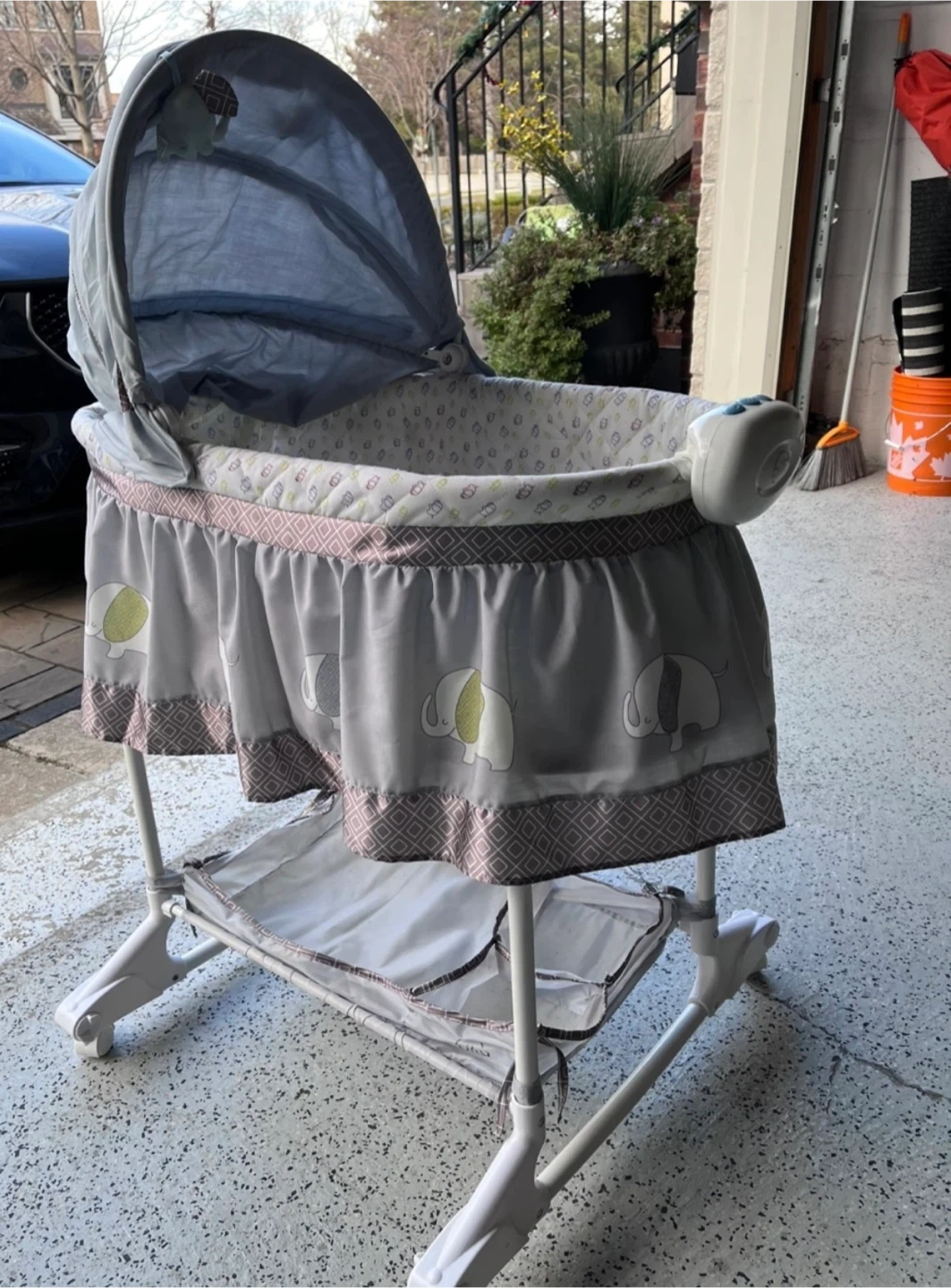 Gently used bassinet, perfect for newborns! It's in great condition and comes with a removable canopy. The bassinet features a cute elephant design and a storage shelf underneath