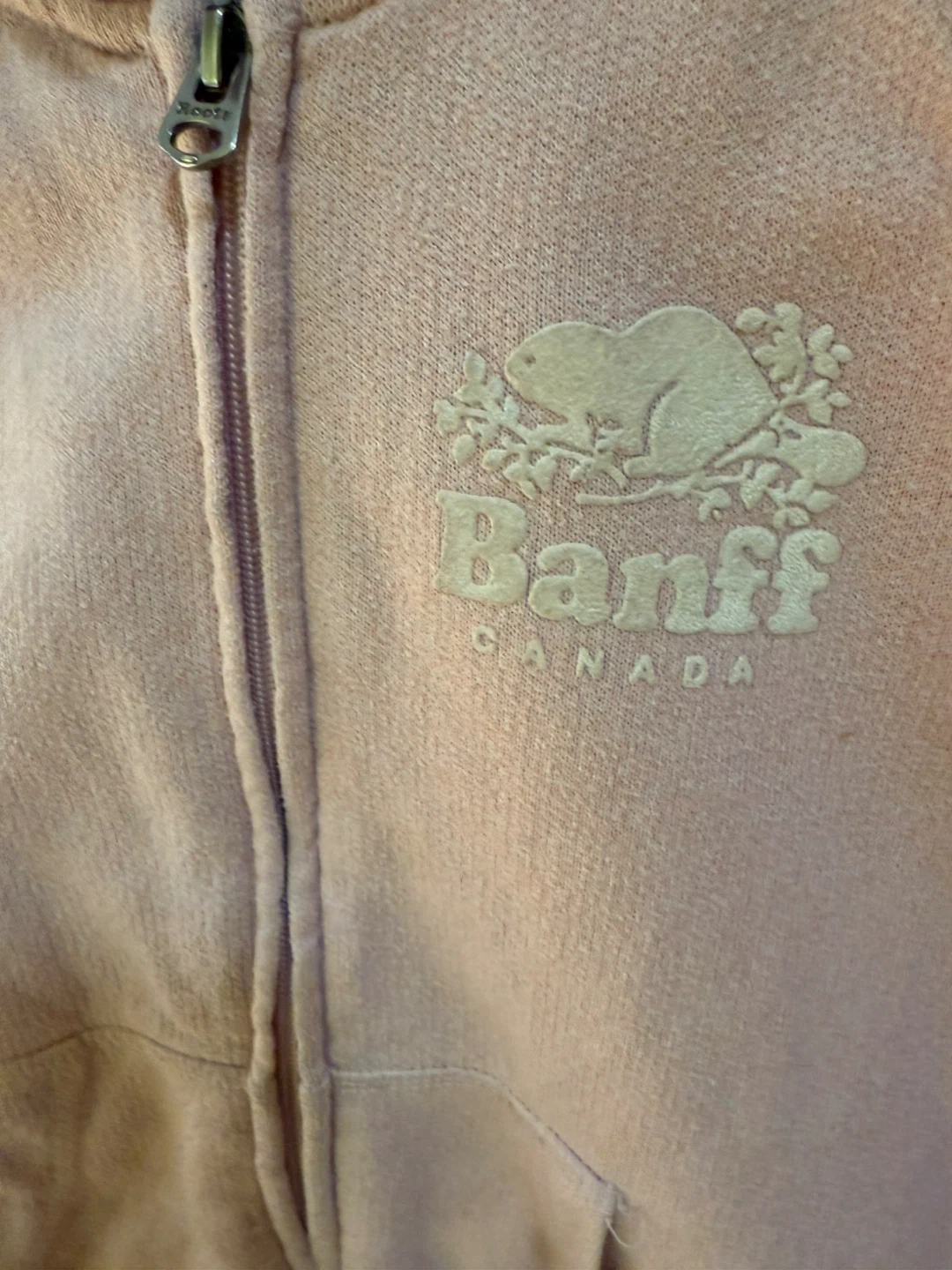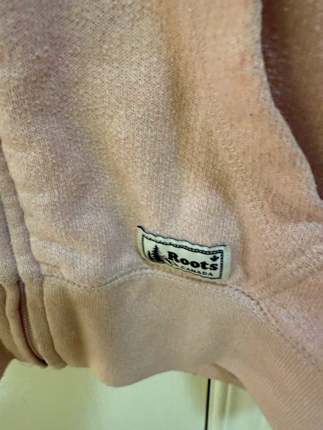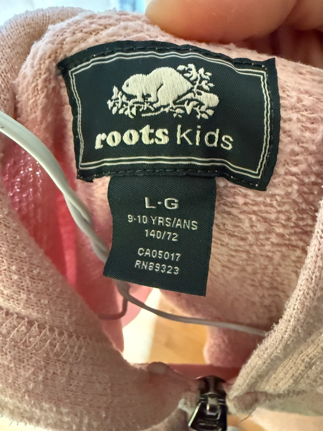 1000+Selling a cute Roots Kids Banff zip-up hoodie in a light pink colour. It's a size L, which fits kids aged 9-10 years. It's in great condition and perfect for layering!