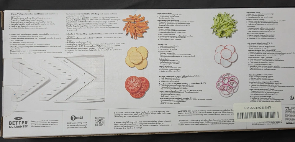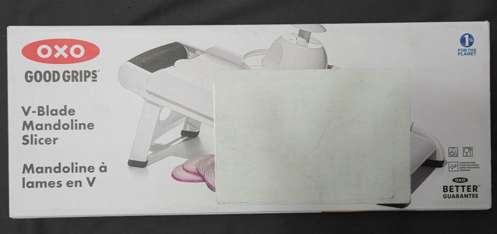 I'm selling an OXO Good Grips V-Blade Mandoline Slicer. This mandoline features sharp, stainless steel V-blades that easily slice fruits and vegetables. It also has non-slip feet and a food holder to protect your hands. It's dishwasher safe for easy cleaning.
