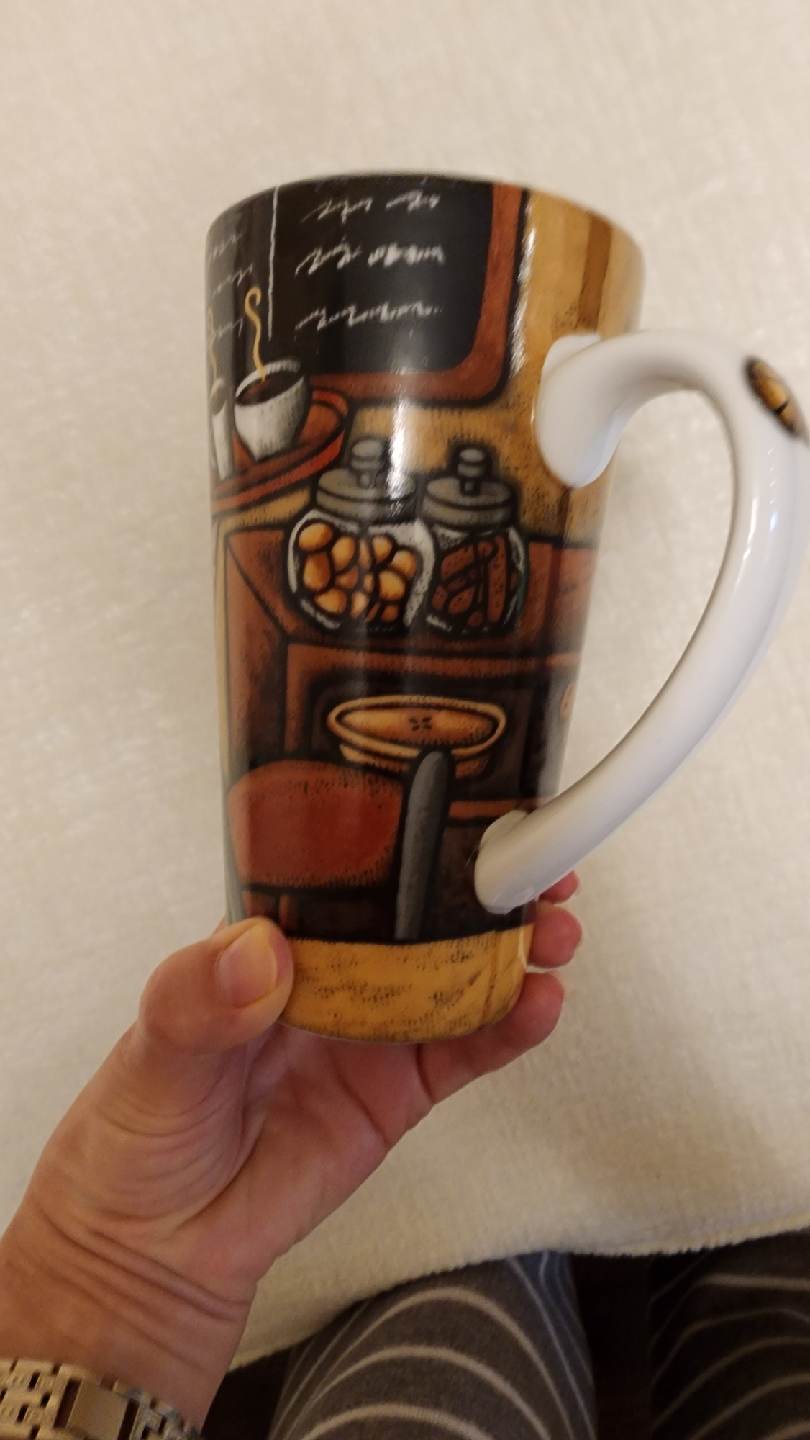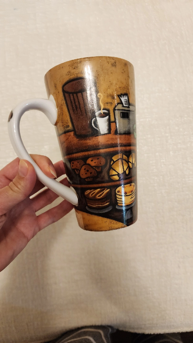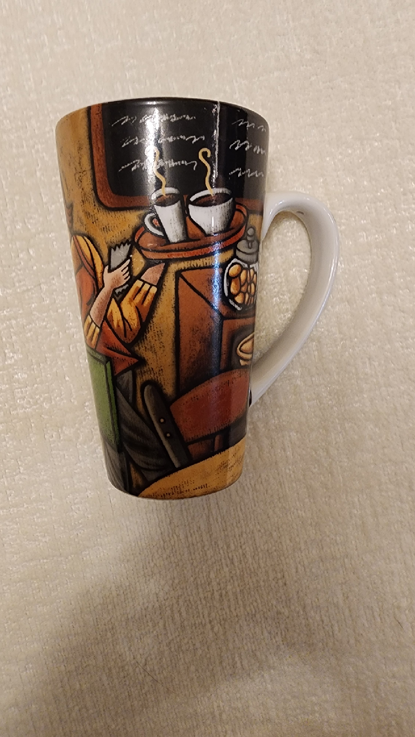 Selling a tall coffee mug with a decorative cafe scene of pastries and coffee cups. Great for adding a touch of European charm to your morning coffee routine!
