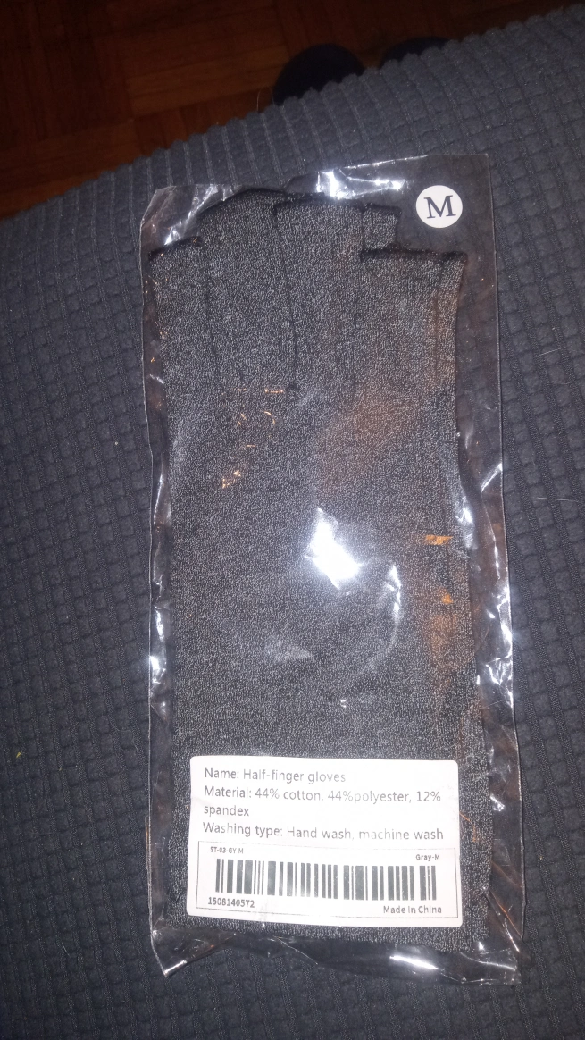 Half-finger gloves in size medium and gray. The gloves are made of 44% cotton, 44% polyester, and 12% spandex. They are machine washable as well.