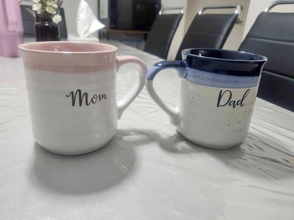 Beautiful matching Mom & Dad mugs made with durable stoneware. Perfect for coffee, tea, or any hot/cold beverage. Microwave safe and easy to clean.