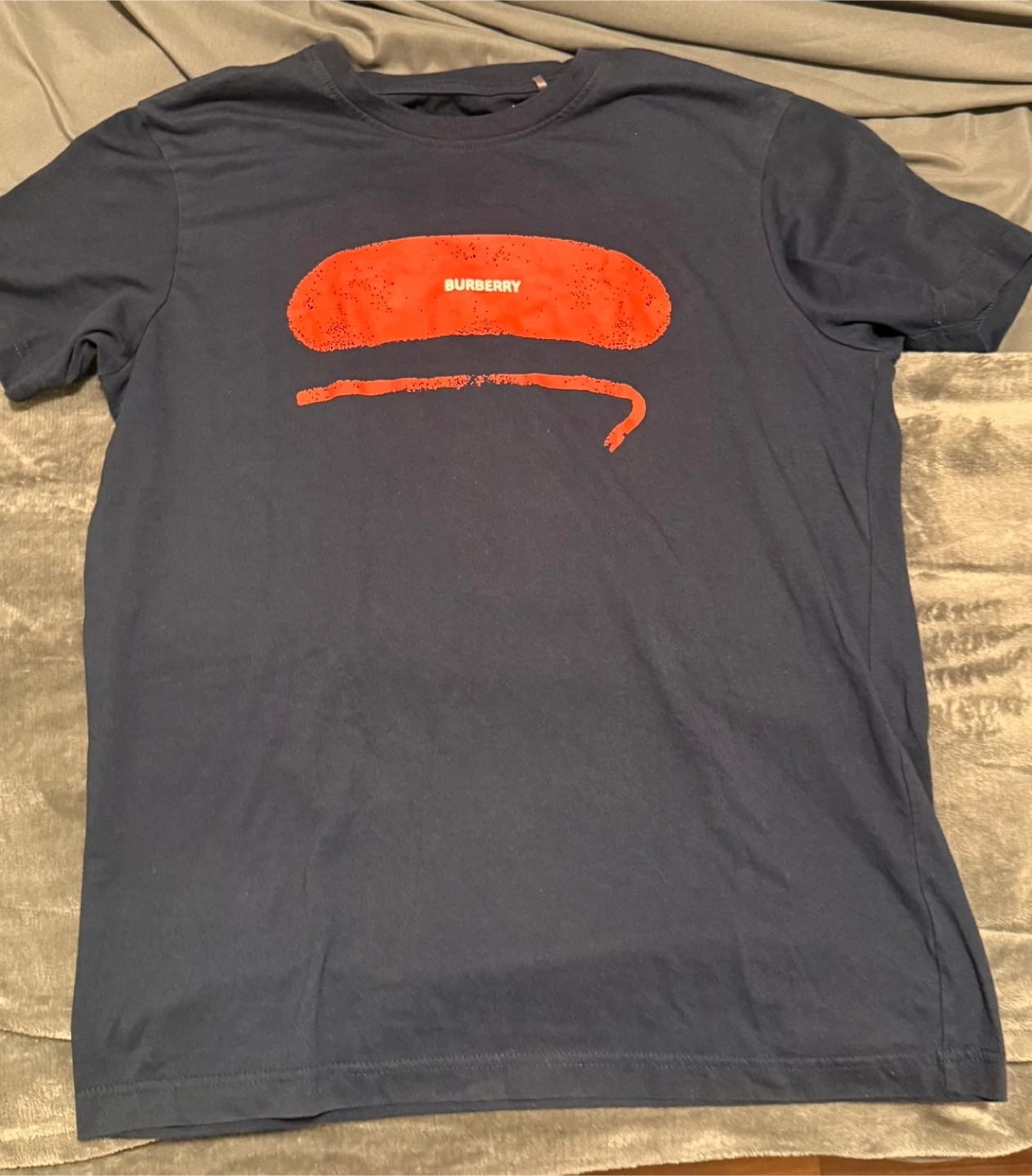 Here's a stylish Burberry T-shirt in a nice shade of blue! It features a unique graphic design on the front. The shirt is a size Large and is made in Vietnam. It's in great condition and ready for a new home!