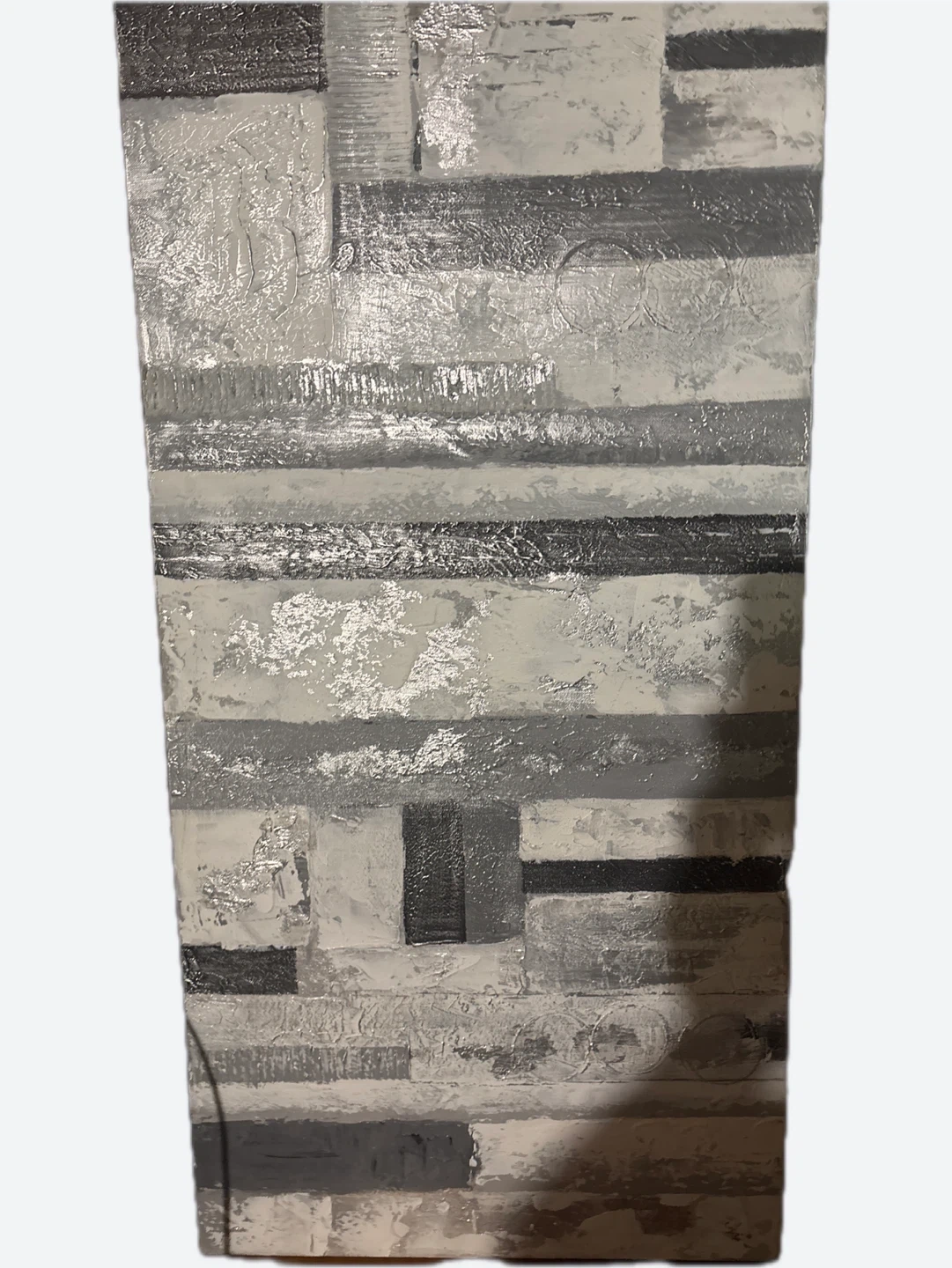 Selling a beautiful abstract wall art piece in shades of grey and silver. It's in great condition and would add a touch of modern elegance to any room! The texture is really unique, with raised portions and shimmering accents