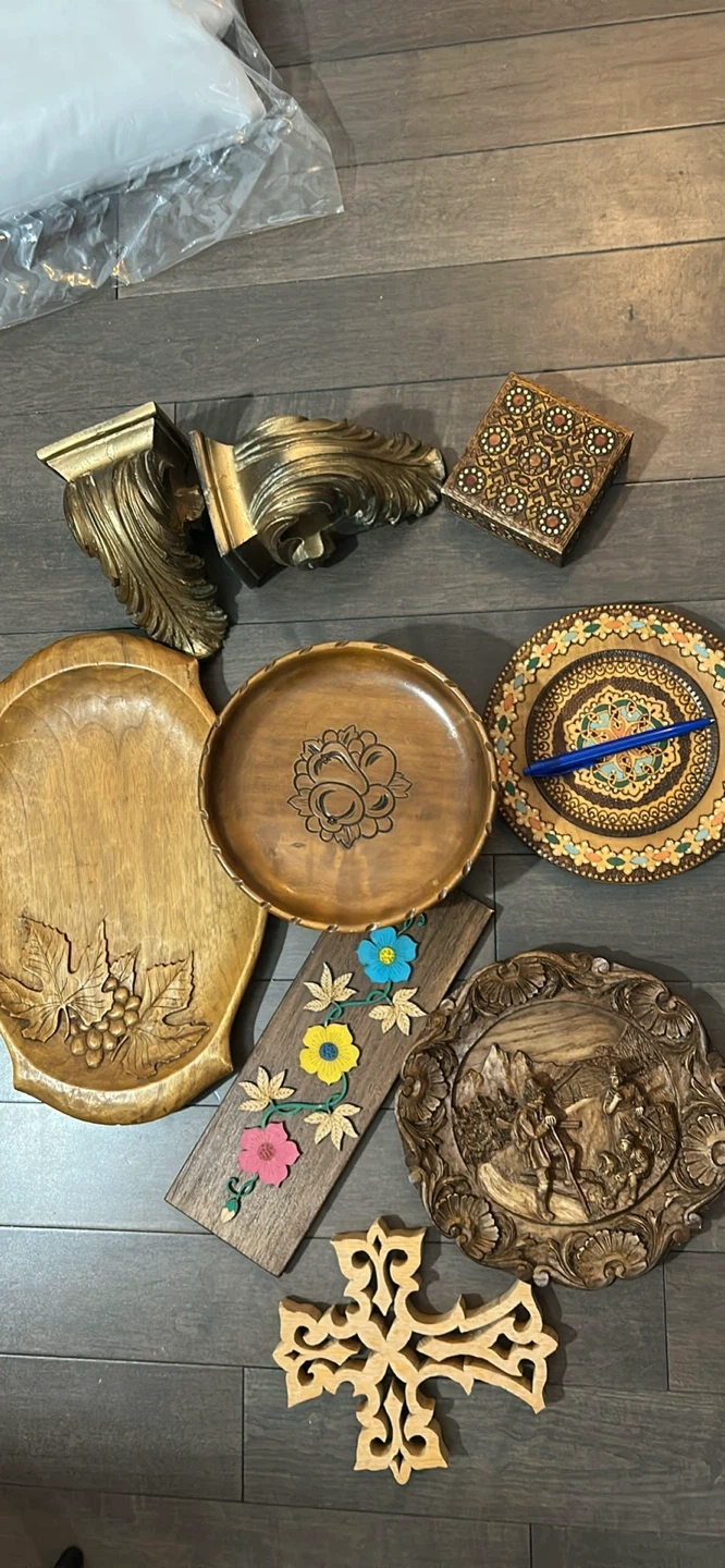 A collection of hand-carved wooden decorative items. Includes wall shelves, wooden plates, a decorative box, and a cross. Perfect for adding a rustic touch to your home decor! $5 each.