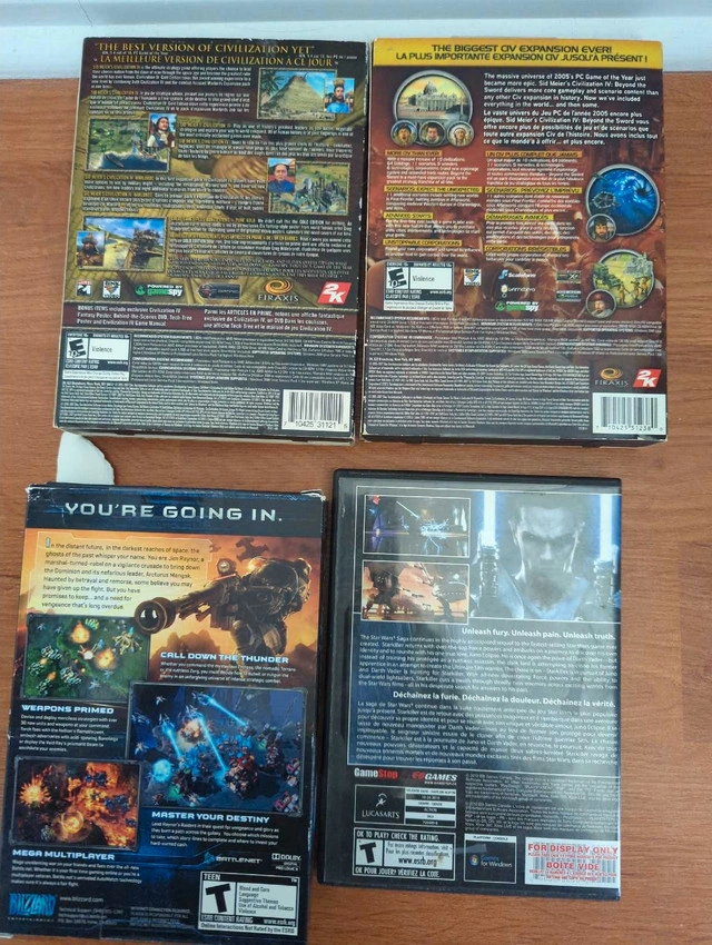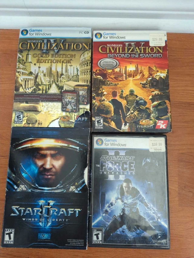 Selling a collection of used PC games, including Sid Meier's Civilization IV Gold Edition, Civilization IV Beyond the Sword, StarCraft II Wings of Liberty, and Star Wars The Force Unleashed. These games are classics and offer hours of entertainment. All games are in good condition and include their original cases and discs. Perfect for any PC gaming enthusiast looking to expand their collection! If the ad is up, the games are still available!